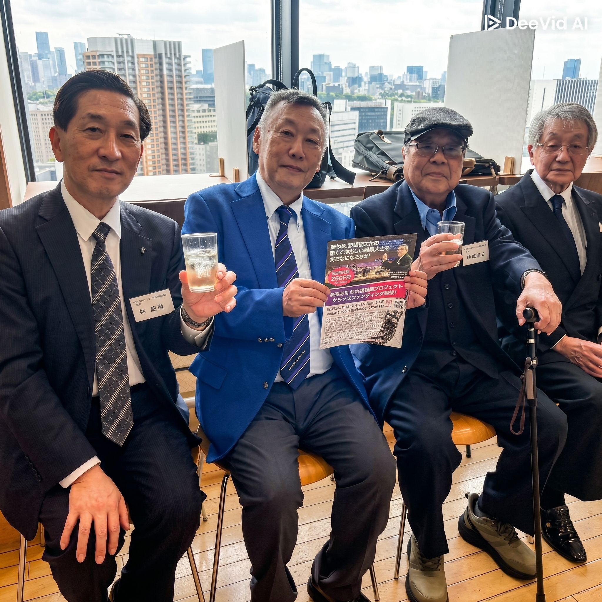 右隣は本日最年長95歳になる根田先輩です。お二人とも歳を感じさせず、いつもダンディですね。一番左端が本プロジェクトのリーダー林先輩です。その右隣が有志のメンバーの松本です。