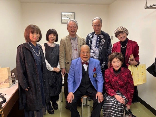 開演前に激励に訪れた甲斐先生とマンドリン倶楽部のファンの皆さま。