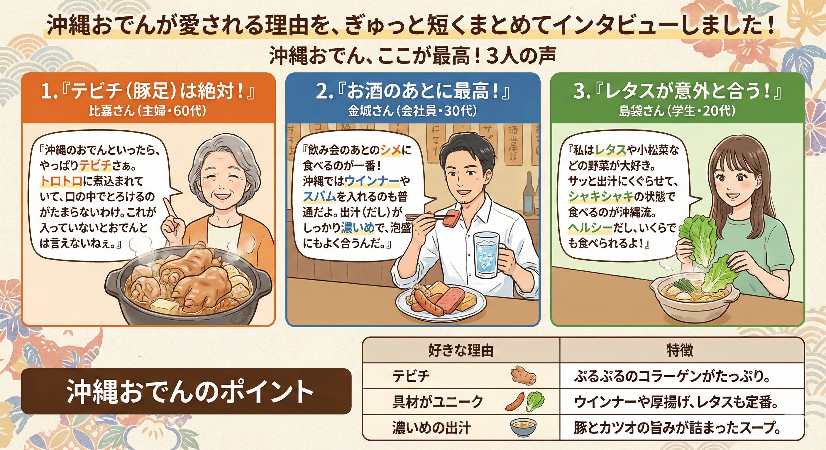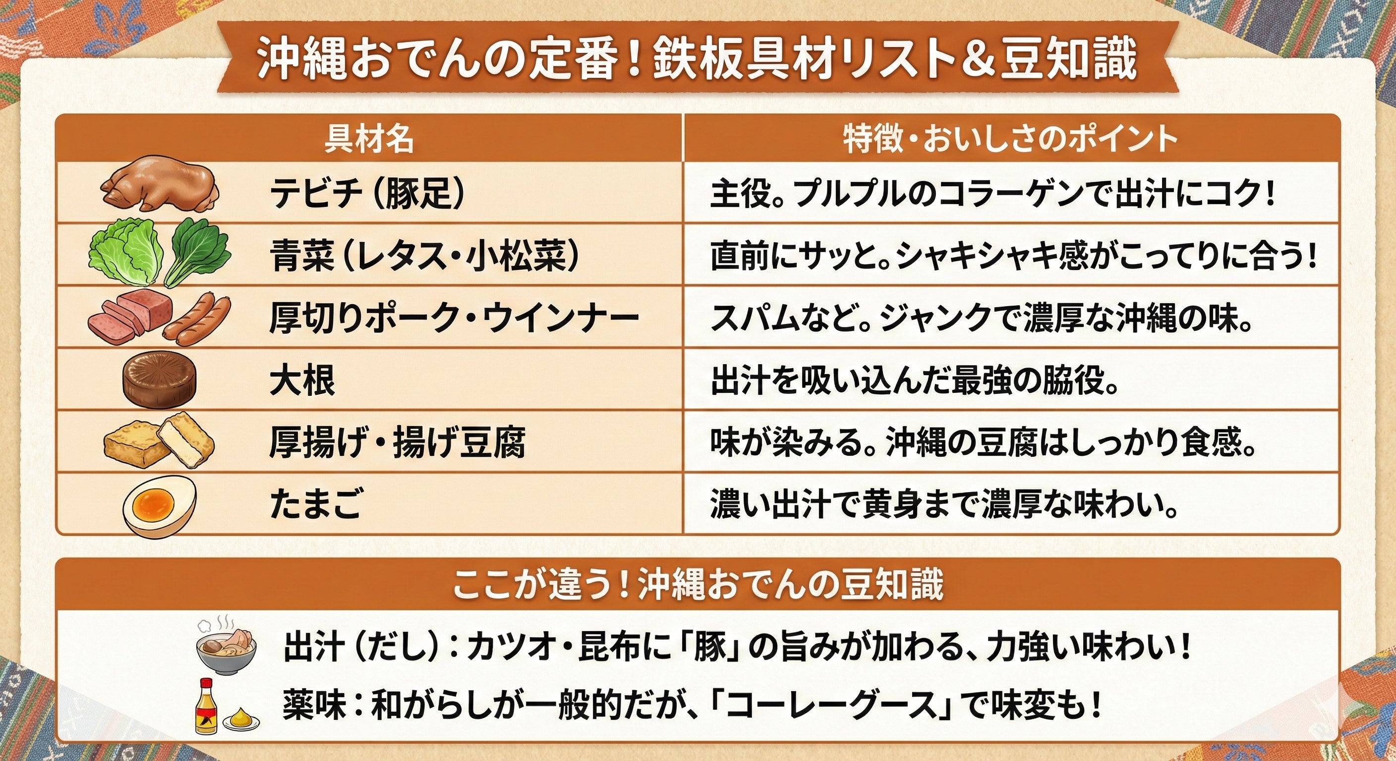 初めての方でもこれを見れば、沖縄おでんの「ガッツリ感」がひと目で伝わるように、主な違いを3つのポイントでまとめました。