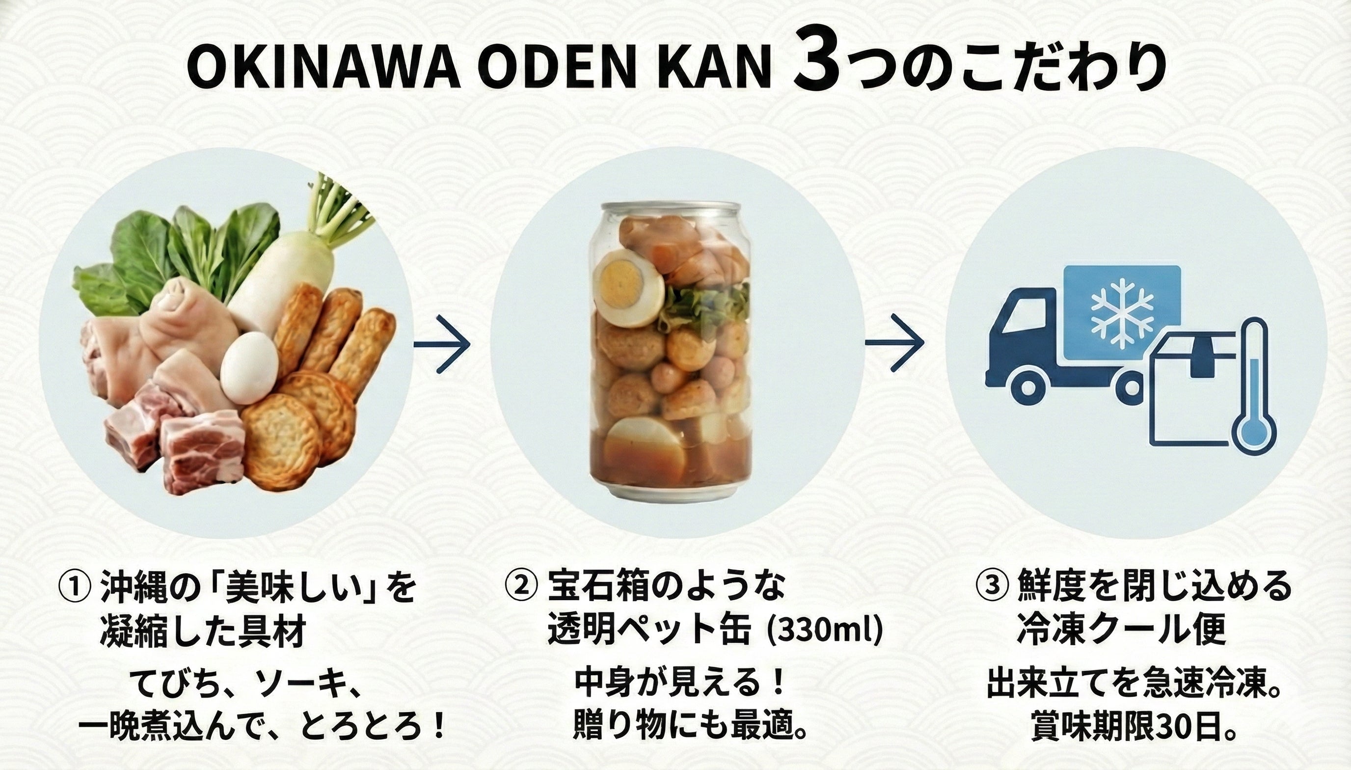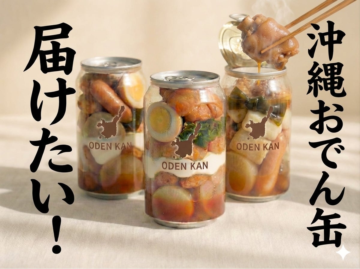 そんな思いから、地元・石垣島の味を凝縮し、目でも楽しめる透明なデザイン缶に詰め込んだ「OKINAWA ODEN KAN」プロジェクトを立ち上げました。
