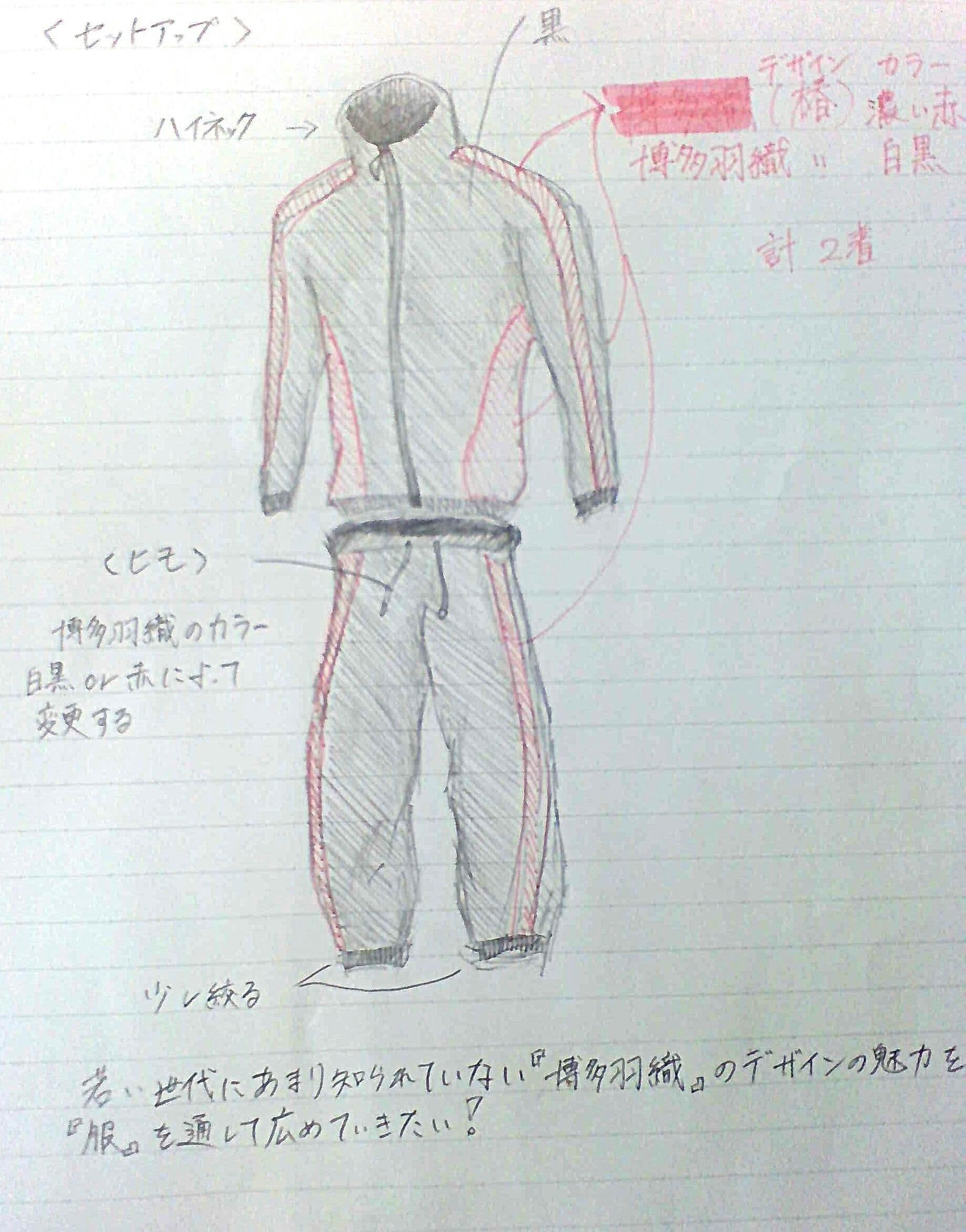 そこで、「博多織」を身近な服に取り入れ、柄だけでなくその背景にある伝統や歴史もあわせて伝えることで、多くの人にその魅力を知ってもらいたいと考えました。福岡の伝統である「博多織」の歴史が、これからも受け継がれていくことを願っていますし、少しでもその役に立てたらと思い、このプロジェクトを立てました。