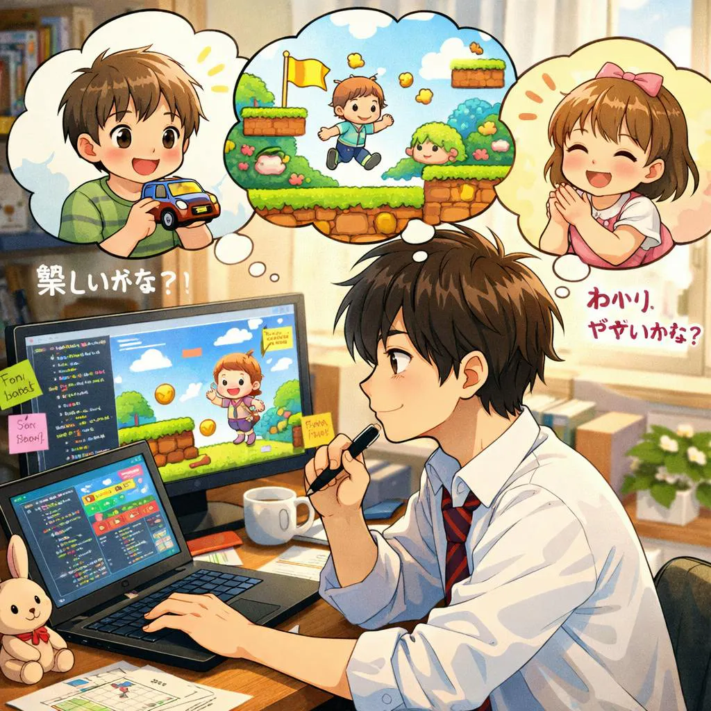 作るゲームの案として、操作が簡単で内容が単純。「おつかい」などを題材にして親しみやすい内容にする。などの工夫をして、ゲームをプレイする子が楽しいと感じることのできるゲームを作りたいと考えています。