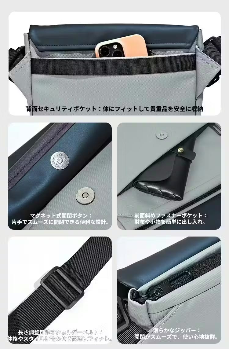 ・長さ調整可能なショルダーベルト:体格やスタイルに合わせて快適にフィット。