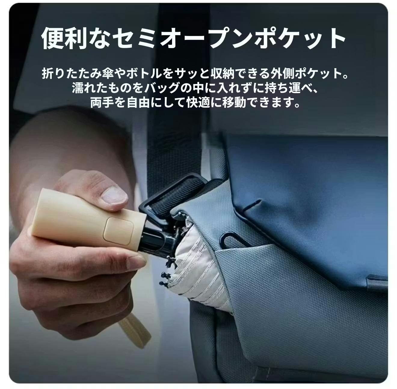 ・前面斜めファスナーポケット:折りたたみ傘や小物を簡単に出し入れ。