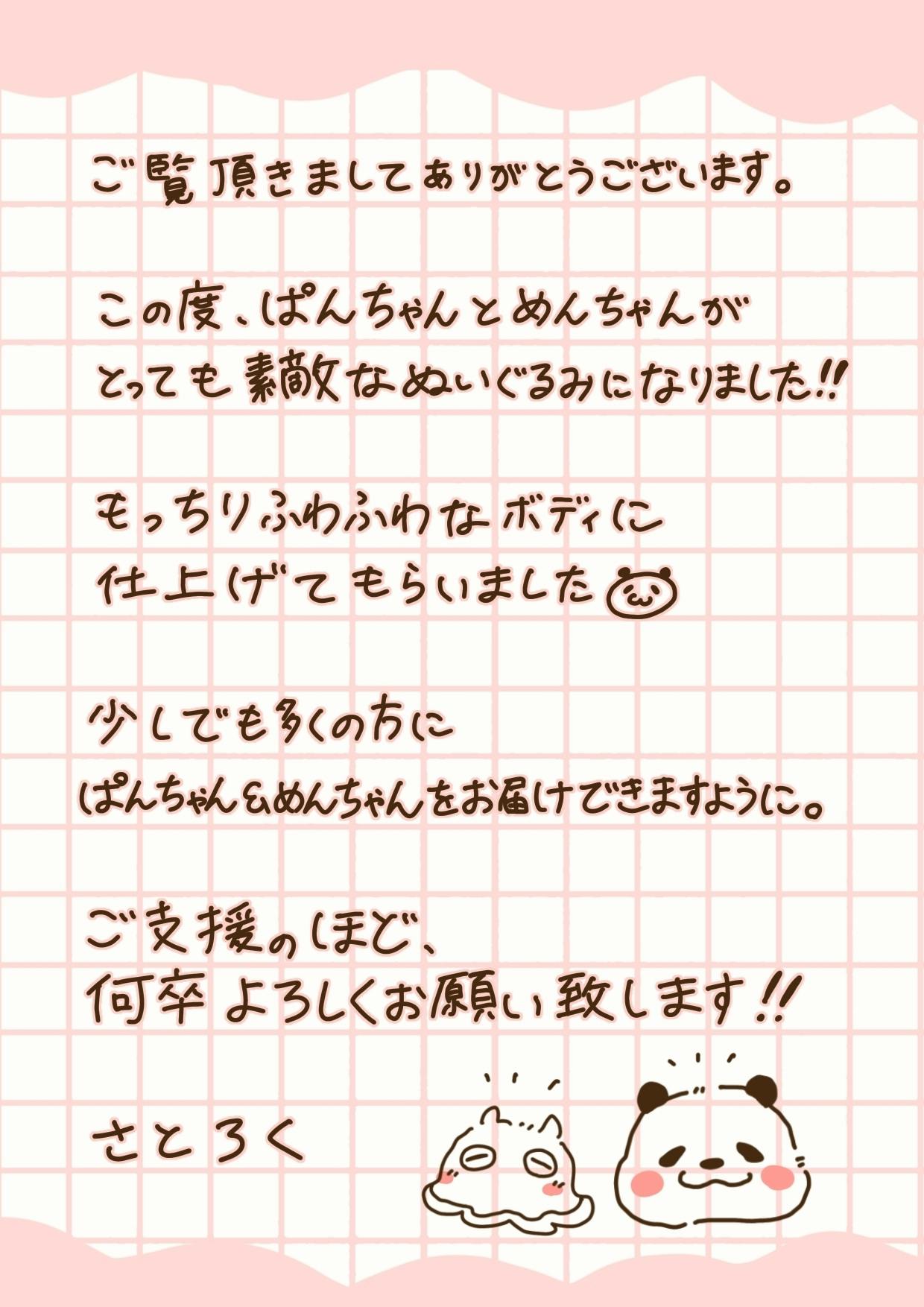 やさしげな表情のぱんちゃん&ふわふわ素材のめんちゃんに癒されませんか♪