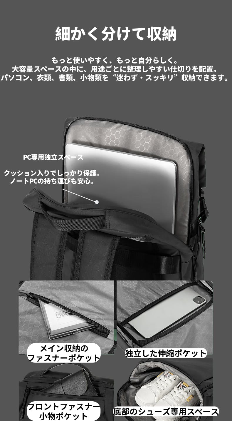 構造:多層ポケット・独立シューズルーム・PC専用層