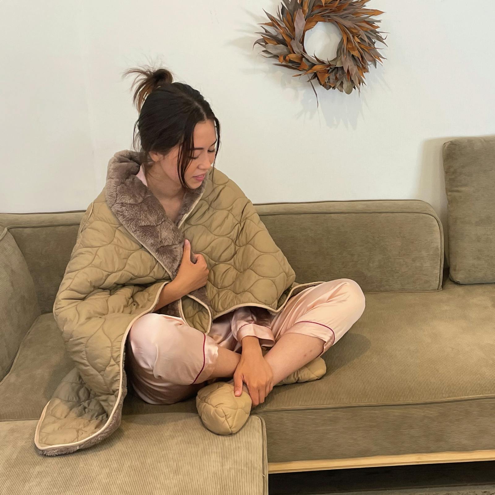 - 掛ける・履く・包む。これ1枚で冬を制す大人の防寒。芯まで温まる蓄熱クッション&ブランケット