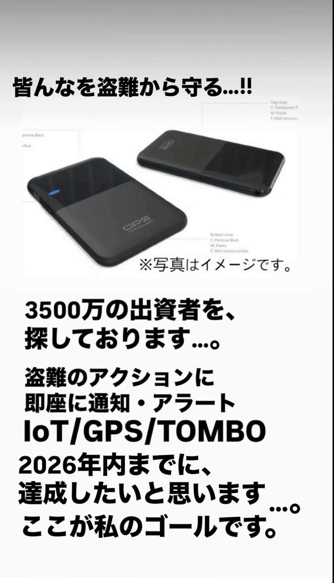 このプロジェクトが達成したら次はGPS・TOMBOを開発し、全国の二輪・四輪の盗難を阻止をします!!厚さ1cn×名刺サイズ、1回の充電で電池持ち1カ月。
