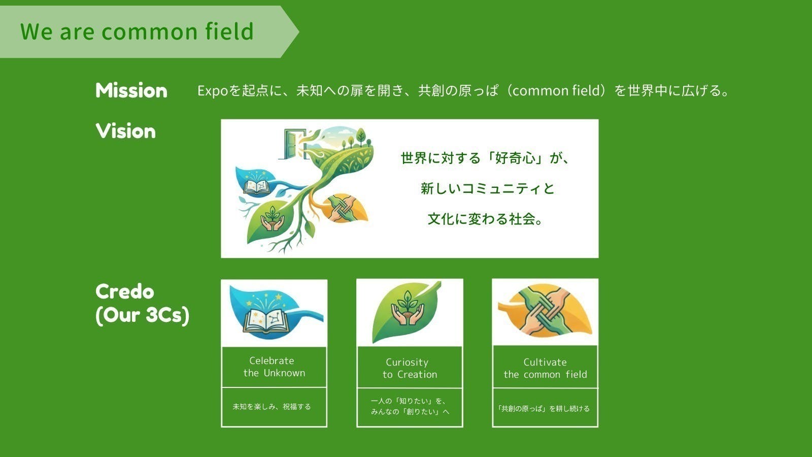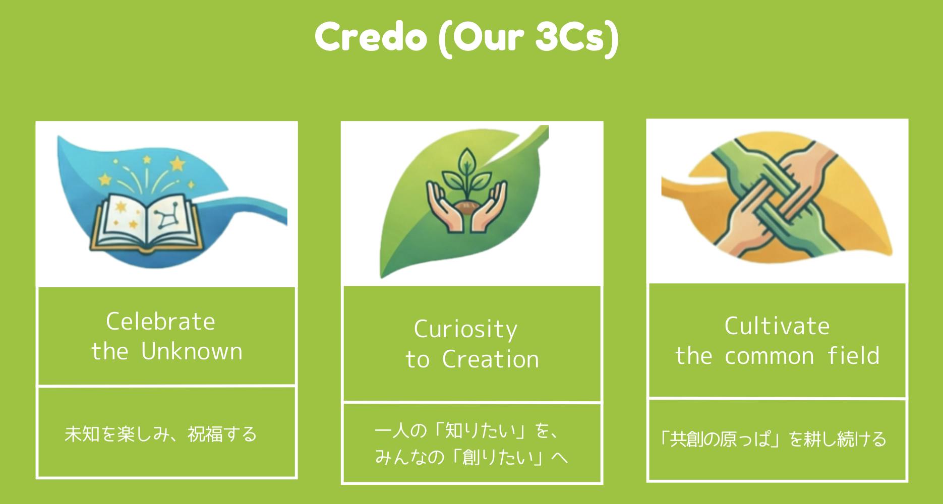 ▲common fieldのCredo(Celebrate the Unknown、Curiosity to Creation、Cultivate the common field)