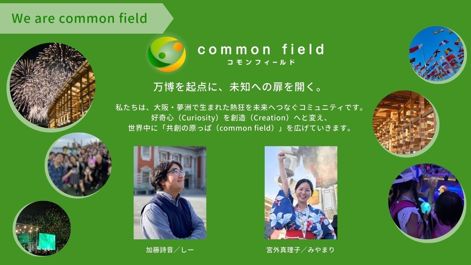 はじめまして、common field代表のしー(加藤詩音)とみやまり(宮外真理子)です。私たちは2025年大阪で芽生えた情熱を未来へつなげる団体です。世界中の多様な人々と出会い、学び合える場所を継続的に提供していきたいという想いから活動を始めました。