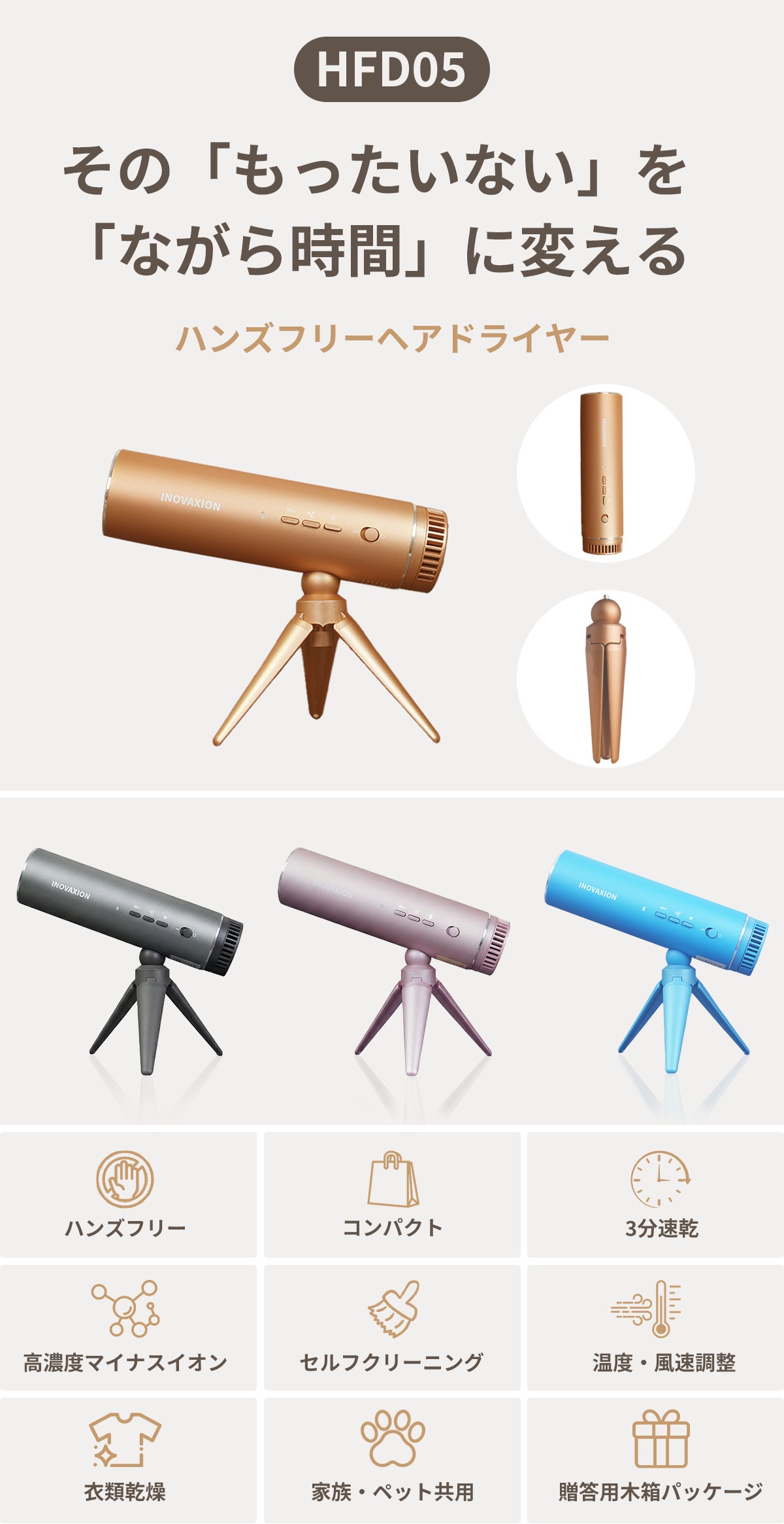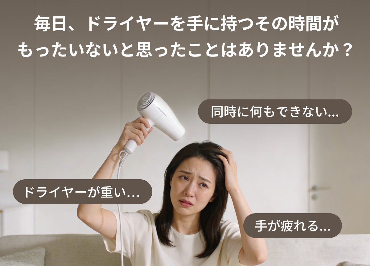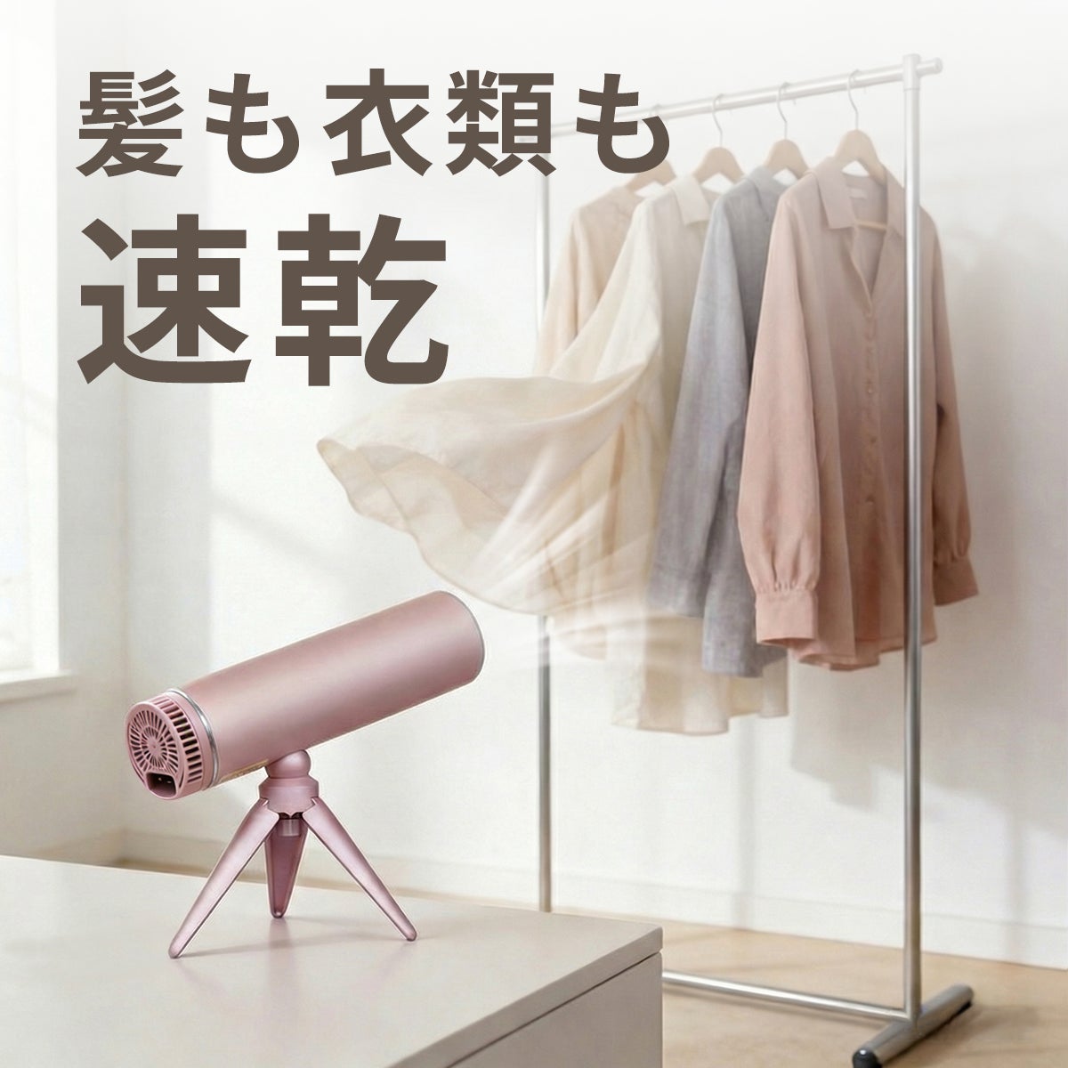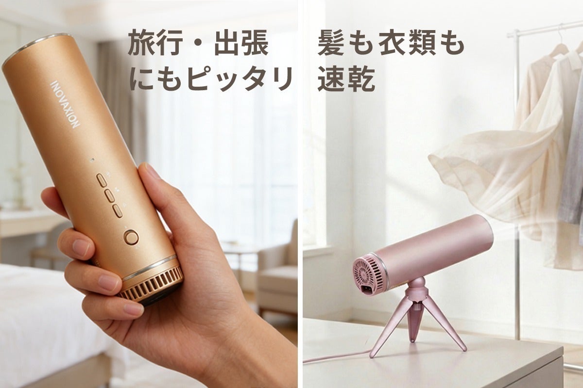 スタンドに置くだけ、壁に掛けても使えます。角度が自由に調整可能。ドライヤーを持ち続ける手の疲れから解放されます。手がふさがらないから、髪を乾かしながらメイクや朝の支度が進み、貴重な時間を有効に。コンパクトで専用収納袋にすっきり収まるので、出張や旅行先での衣類乾燥もこれ一台で。