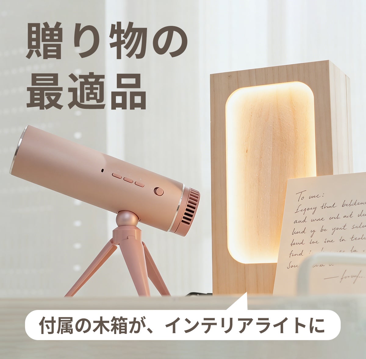洗練された機能美を備えた本体を、高級感のある天然木箱に収めてお届けします。この木箱は、優しい光を灯すインテリアライトとしてもお使いいただけ、贈った後もずっと特別な空間を彩ります。スペースグレイ、ローズゴールドなど全4色からお選びいただけ、特別な方への贈り物として、きっと喜ばれる一品です。