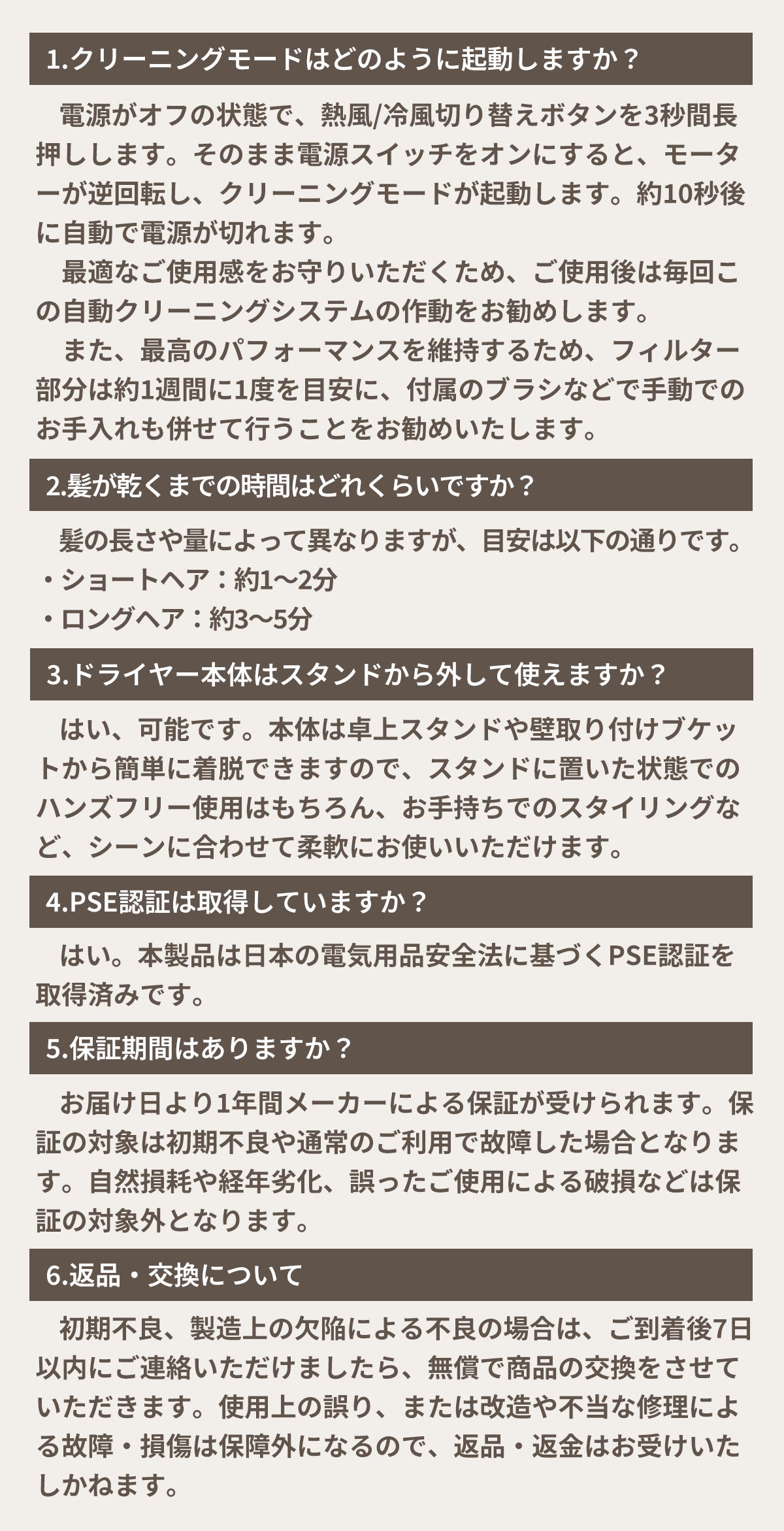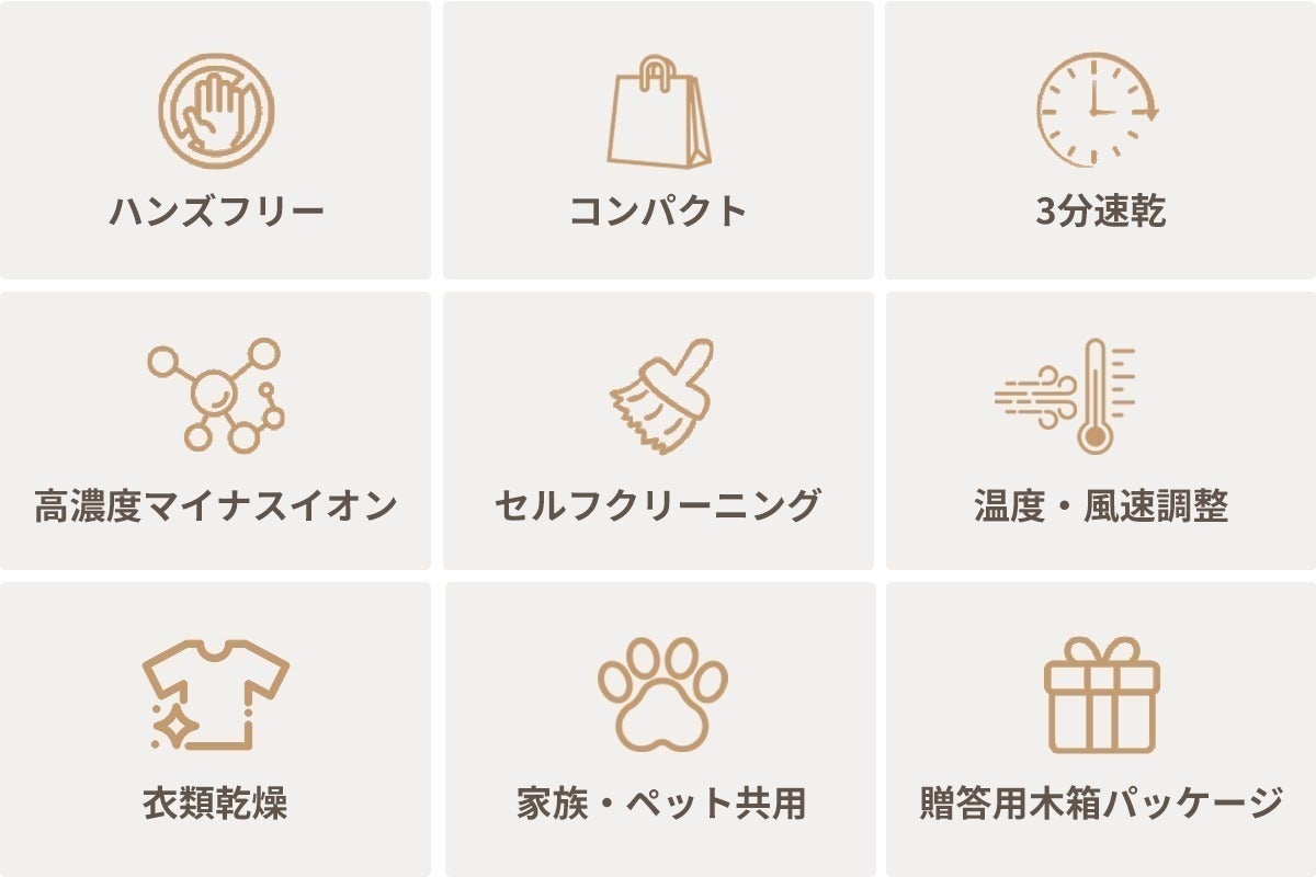 冷・温・熱の3段階温度と、弱・中・強の3段階風量を自由に組み合わせられます。地肌を冷やしたい時、早く乾かしたい時など、シーンやお好みに合わせて、ぴったりの風を作れます。安全設計(過熱防止等)も万全なので安心です。