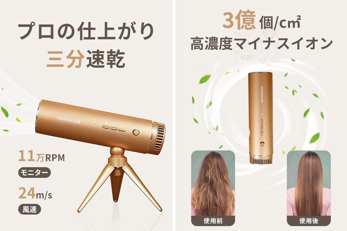 11万回転高速モーターが生み出す強く集中した風で、髪の根元から素早く水分を飛ばします。従来よりも格段に短い時間でサラリと乾かすことができ、髪への熱ダメージを軽減します。