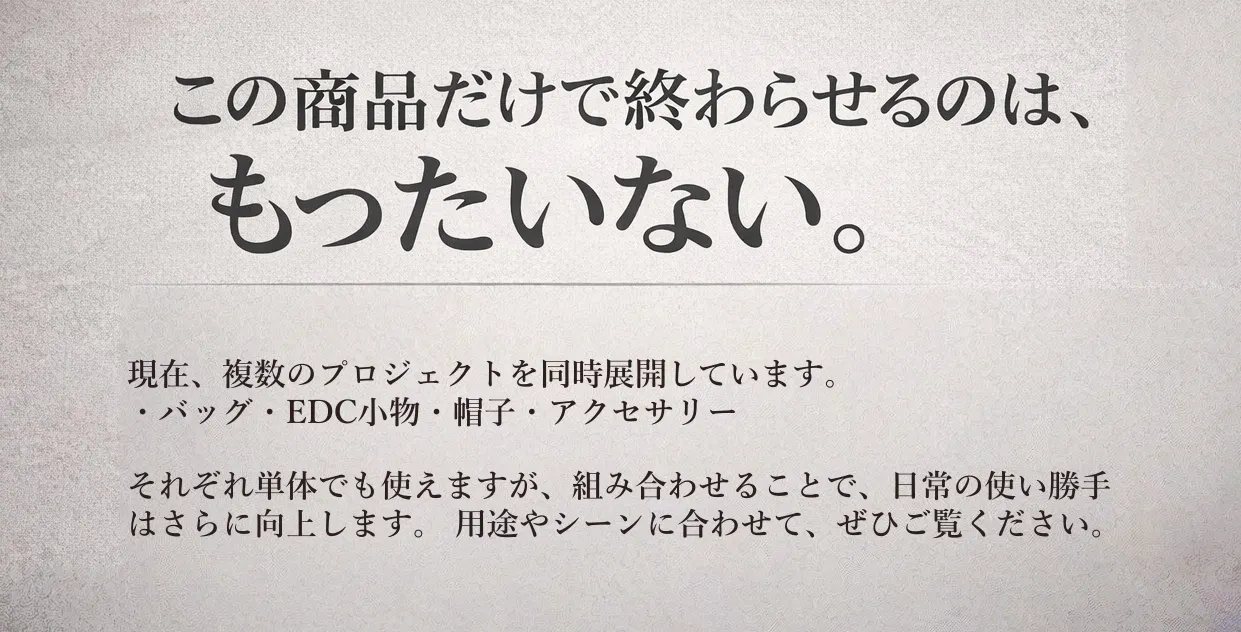2026/03/30 20:00いつも応援いただき、本当にありがとうございます。CAMPFIREにて挑戦中の本プロジェクトも、いよいよ残り1日となりました。ここまで多くのご支援・温かいメッセージをいただき、チーム一同、心より感謝申し上げます。今回のプロジェクトは、「日常のちょっとした不便を減らしたい」という想いからスタートしました。荷物が増える日も、移動が多い日も、これ一つでスマートに対応できるバッグを目指して開発しています。 そして今、皆さまの応援によってここまで進むことができました。このプロジェクトをさらに多くの方に届けるため、最後のご協力をお願いできませんでしょうか。・「気になっていた」という方は、このタイミングでのご支援・SNSやご友人へのシェア・もう一度の応援(追加支援も大歓迎です)プロジェクト一覧はこちらhttps://camp-fire.jp/profile/no_one_else/projects※各プロジェクトごとに割引・在庫が異なります。気になるアイテムはお早めにご確認ください。残り1日。最後まで全力で駆け抜けますので、ぜひ見守っていただけましたら幸いです。引き続き、応援のほどよろしくお願いいたします。株式会社NOEプロジェクトスタッフ一同 もっと見る