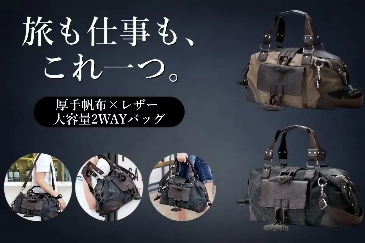 【本日終了】知らずに終わるのは、もったいない!!旅も仕事もこれ一つ。厚手帆布×レザー補強の大容量2WAYボストンバッグ