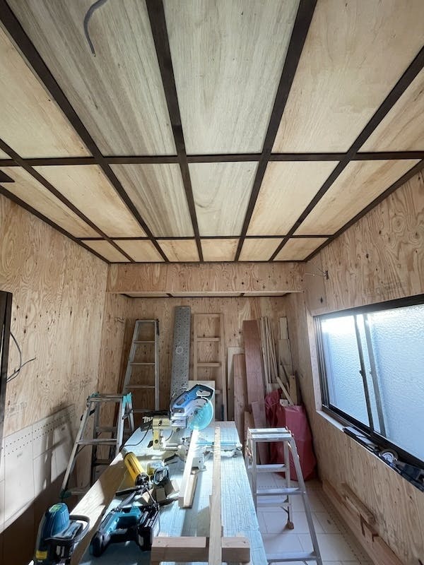 現在は1階床はフローリングが敷かれ、天井もほぼ完成。