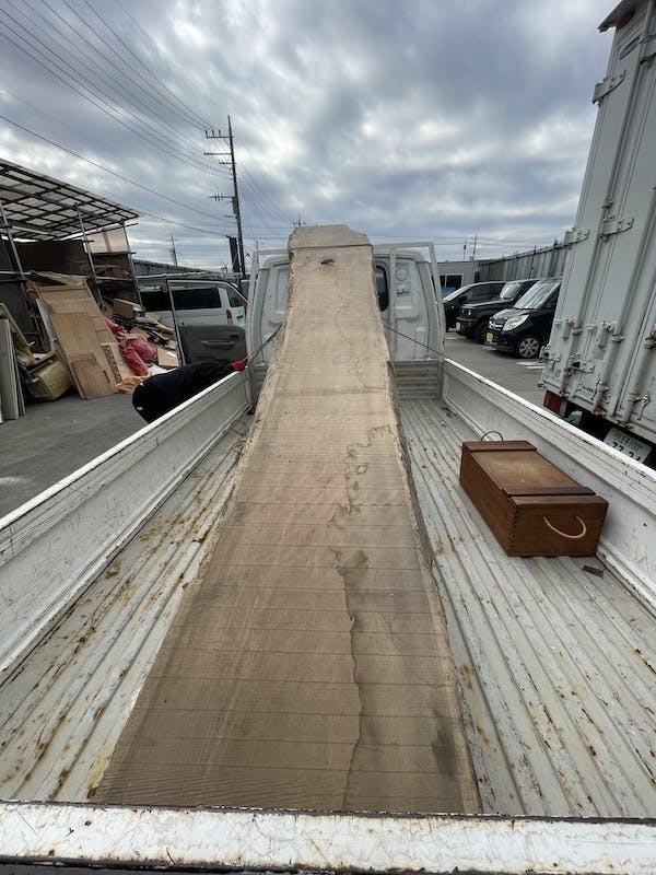今週には日帰り東京往復して、北海道の楠の一枚板をトラックで持って帰ってきました