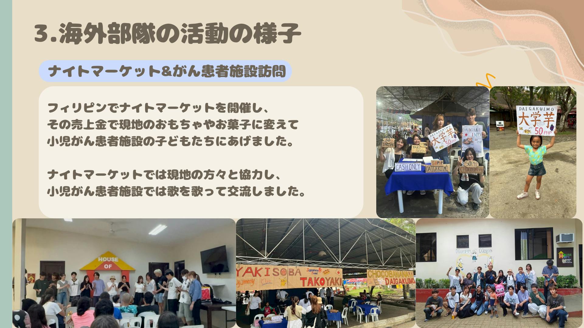 昨年の春には、フィリピンの小学校で子供たちと触れ合ったり、ナイトマーケットでの出店を通して得た収益で、癌と闘う子供たちの施設に支援をする取り組みなどを通して、私たちは「誰かの力になること」を体感してきました。