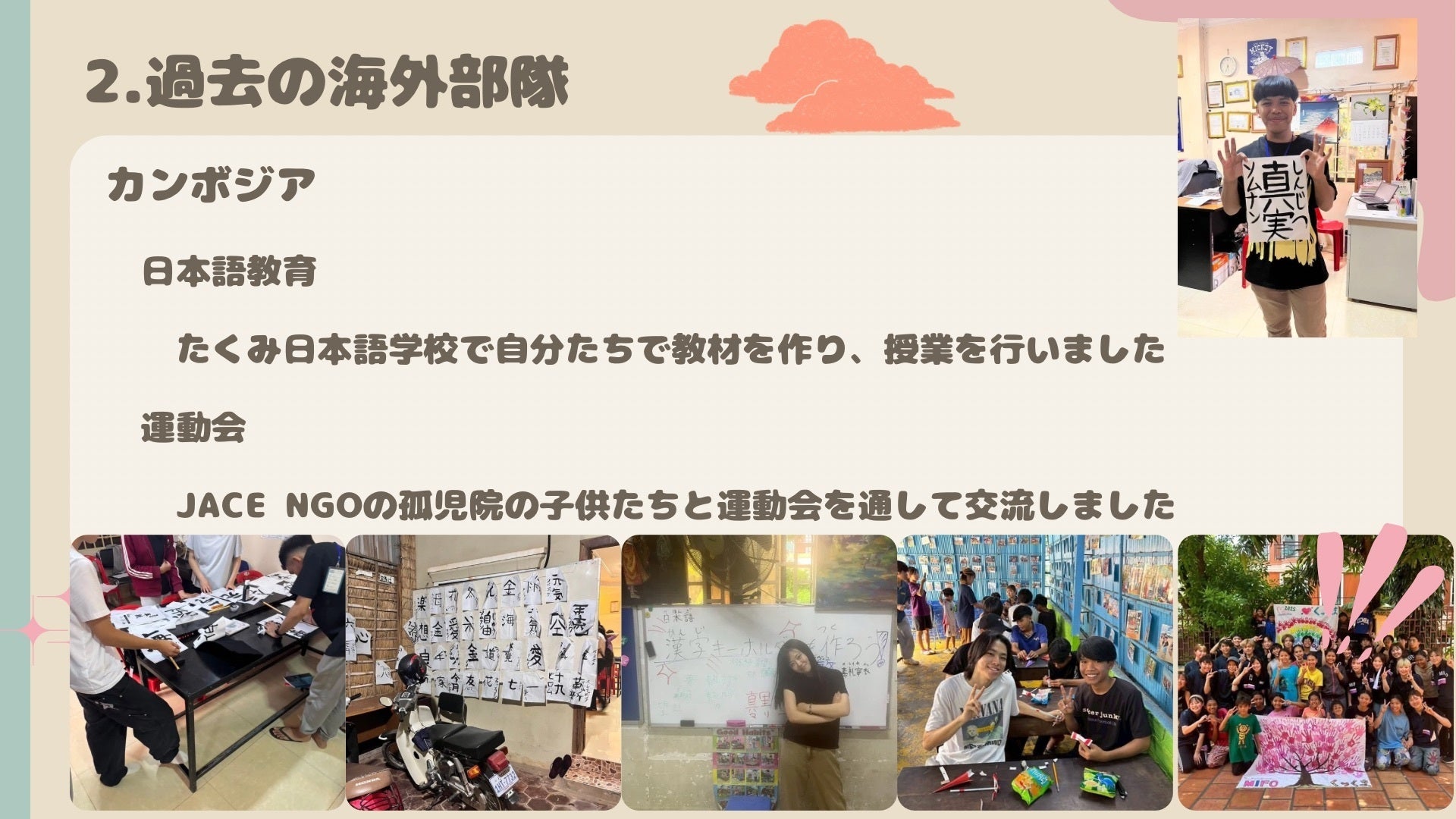 過去の海外部隊では教育ボランティアや異文化交流、孤児院支援などを行ってきました。