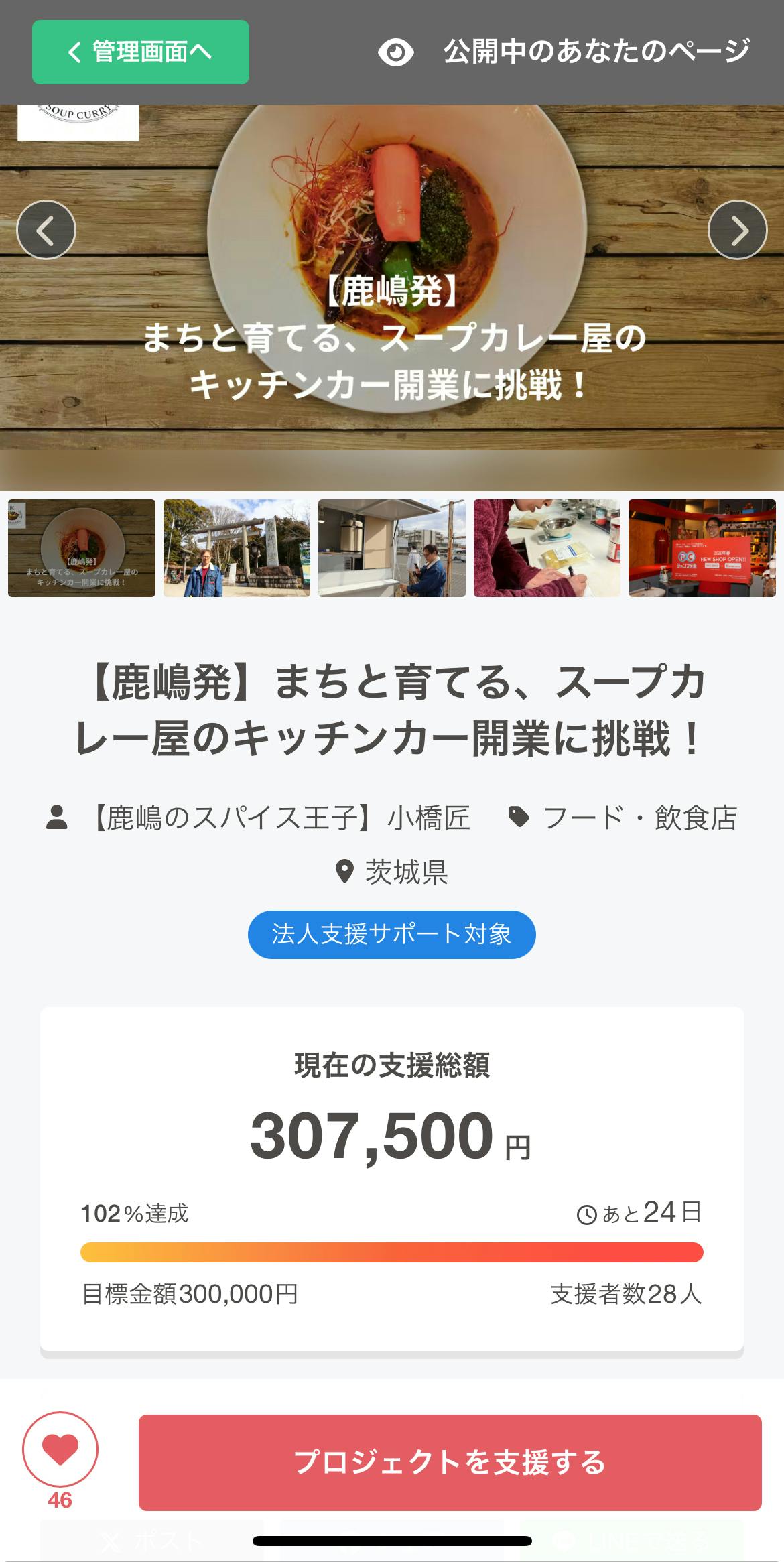 2026/03/07 21:38皆さまの温かいご支援のおかげで、目標金額を達成することができました。本当にありがとうございます。正直、ここまで応援していただけるとは思っておらず、感謝の気持ちでいっぱいです。ただ、今回のクラウドファンディングは資金を集めることだけでなく、匠soupcurryを多くの方に知っていただくことも大きな目的として始めました。期間もまだ3週間残っているため、さらに多くの方に知っていただく機会を広げたいと思い、新たな目標金額を「50万円」に設定させていただきました。ご支援だけでなく、「こんなお店ができるんだ」と知っていただけるだけでも本当に嬉しいです。もしよろしければ、シェアや拡散で応援していただけるととても励みになります。引き続き、応援よろしくお願いいたします! もっと見る
