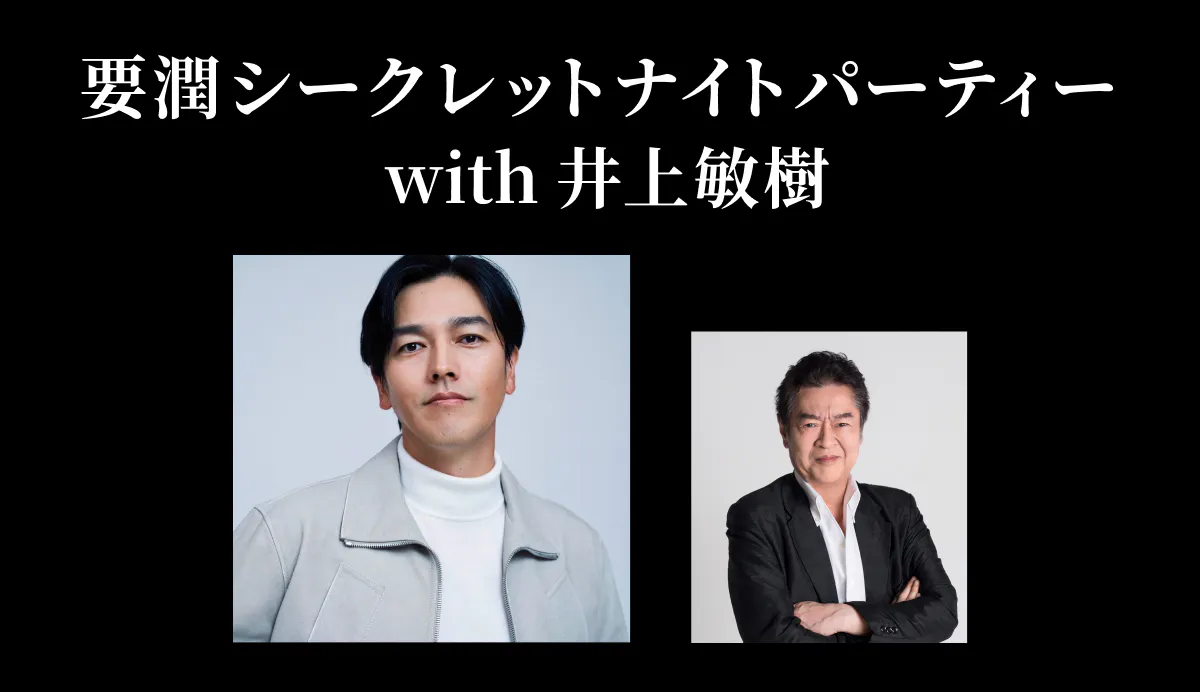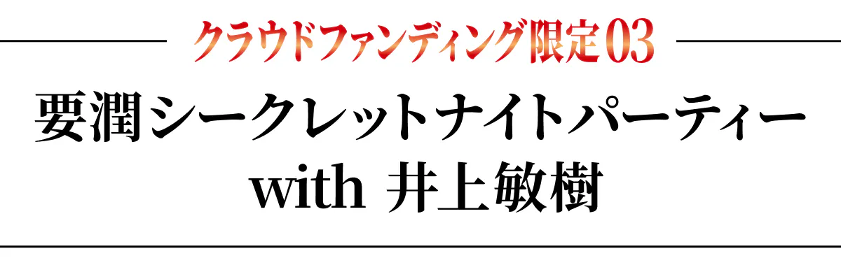 要潤さんがホストを務める少人数限定イベントを開催。スペシャルゲストに『仮面ライダーアギト』のメイン脚本家である井上敏樹さんをお招きして、<秘密の夜会>が幕を明ける。当日まで内容は完全シークレット!イベント開催後のSNS等での情報発信もNGというルールを設け実施します。参加条件はただひとつ、「氷川誠」が好きなこと。一夜限りのプレミアムなひと時にご期待ください。