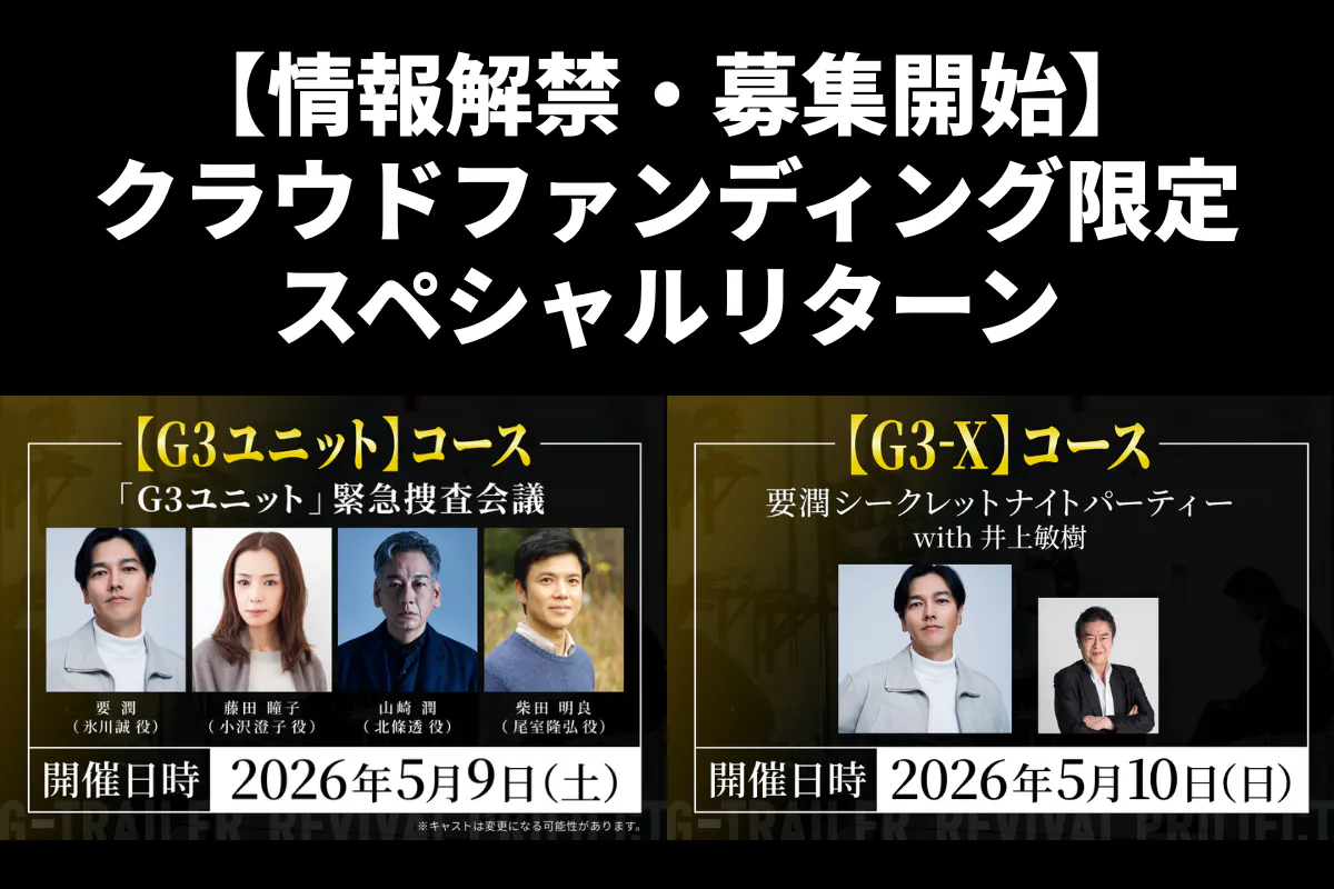 2026/03/27 18:00早いものでクラウドファンディングの公開から2週間が経ちました!あと20日となりました。本プロジェクトをSNSで広めてくださった方、リターンを選んで支援してくださった皆さま、本当にありがとうございます。追加リターンとして、G3ユニットメンバー参加の限定イベントを含む、2種類のコースを追加しました。①【G3ユニット】コース:G3ユニット緊急捜査会議G3ユニットメンバーが集結し、一夜限りの<緊急捜査会議>を開催!要潤、藤田瞳子、柴田明良、山崎潤が25年分の想いを語り尽くす!G3ユニットメンバーのみで単独のイベントを実施するのは、『仮面ライダーアギト』25年の歴史の中でも初めての試みとなる。当日は、25年前の思い出から最新映画のマル秘裏話まで、ここでしか話せない門外不出のエピソードが続々と披露されるトークコーナー、G3ユニットの絆を確かめるゲームコーナー、来場者からの質問コーナー等、様々な企画をご用意しています。最初で最後(!?)の激レアイベントをお見逃しなく!!・開催日時:2026年5月9日(土) 20:15集合 ・所要時間:30~45分程度 ・開催場所:サンシャイン劇場 ・参加キャスト:要潤/藤田瞳子/山崎潤/柴田明良 (変更可能性あり) ・定員:500名まで※詳細は後日個別にご案内いたします。※会場までの交通費は支援者様のご負担となります。▼支援はこちらhttps://camp-fire.jp/projects/925274/backers/new?id=1636744②【G3-X】コース:要潤シークレットナイトパーティー with 井上敏樹要潤さんがホストを務める少人数限定イベントを開催。スペシャルゲストに『仮面ライダーアギト』のメイン脚本家である井上敏樹さんをお招きして、<秘密の夜会>が幕を明ける。当日まで内容は完全シークレット!イベント開催後のSNS等での情報発信もNGというルールを設け実施します。参加条件はただひとつ、「氷川誠」が好きなこと。一夜限りのプレミアムなひと時にご期待ください。・開催日時:5月10日(日)20時以降・所要時間:1時間程度・開催場所:「真アギト展東京会場」会場内※通常会期の閉場後に実施いたします。集合時間等の詳細は、決定次第ご案内いたします。※本イベントは未就学児のご参加はできません。小学生以上のご参加者1名につき、本コースは1件ご購入ください。※会場までの交通費は、支援者様のご負担となります。▼支援はこちらhttps://camp-fire.jp/projects/925274/backers/new?id=1636746今回のクラウドファンディングが最初で最後かもしれないリターンです。あと20日となりました。ここから最後まで走りきりますので、ご支援・応援のほどよろしくお願いします。 もっと見る