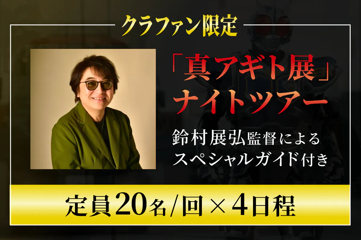 通常の『真アギト展』の会期終了後に、鈴村展弘監督をガイドにお迎えして展示を楽しめる特別なナイトツアーです。当時の制作秘話や監督ならではのお話を聞きながら、『真アギト展』をより深くお楽しみいただけます。