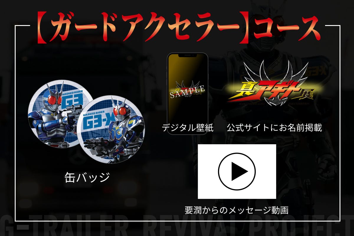 実現に向けてご支援いただくにあたり、皆様を「G3ユニット隊員」としてお迎えし、ともに本プロジェクトを盛り上げていただきたいと考えております。支援者全員のお名前は、『真アギト展』の公式サイトに掲載されます。それに加え、限定グッズや特別なナイトツアーもご用意しました。