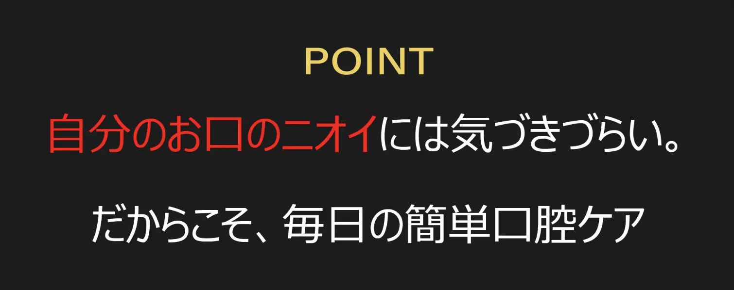 「自分のお口のニオイに気づきにくい理由は、"嗅覚の慣れ" 」であることから、ケアが行き届いておらず、24時間慢性的にニオイが発生している人ほど、自分のお口のニオイに気づきにくいものです。