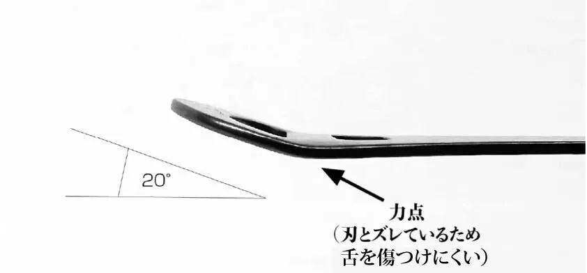 力を強くかけても、力点が刃とズレているため、舌に刃が強くあたりません。
