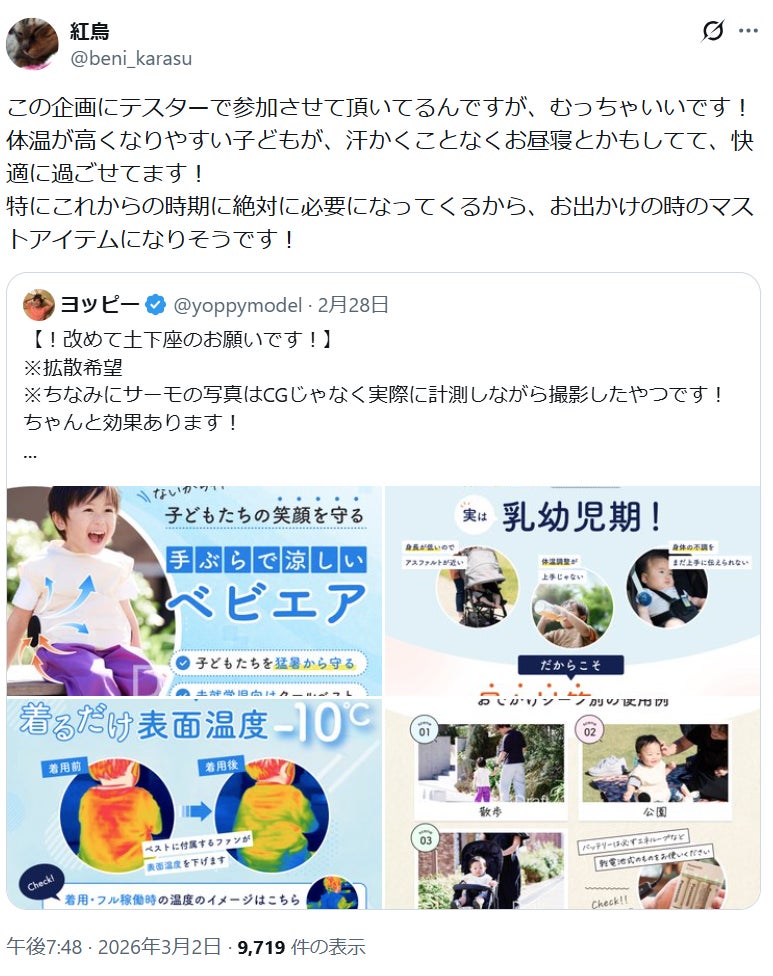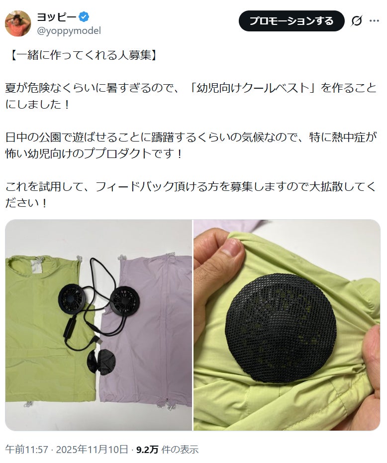2026/04/12 09:16こんにちは!だんだん気温も高くなってきましたね!今年も猛暑が予想されている中、お子さまの熱中症対策は大丈夫でしょうか!現在、幼児向けの熱中症対策ベスト「ベビエア」をご支援頂いた方には6月上旬のお届けになりますので、夏の熱中症対策に間に合います!ベビーカーに敷くファンシートと違い、ベビエアならベビーカーを嫌がる子どもにも使えますし、子どもが複数名いても同時に使えます!ぜひご検討ください!子どもを猛暑から守る「未就学児向けクールベスト #ベビエア 」を作りたいhttps://camp-fire.jp/projects/925290/view もっと見る
