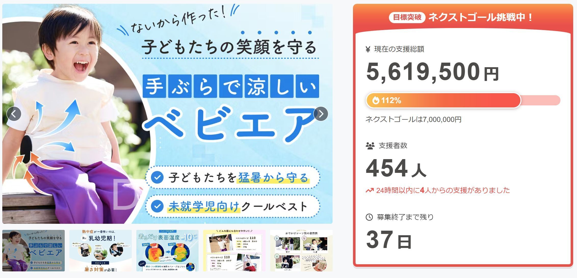 2026/03/24 12:00皆様!ありがとうございます!おかげさまで500万円の目標金額を達成しました!これで在庫の発注をすることが出来ます!本当にありがとうございます!また、反響の大きさから「やっぱりこういう製品は強い需要があるな」というのを身に染みて感じています!温暖化の折、小さい子どもの熱中症対策は急務ですし、来期のカラーバリエーション追加やサイズの追加を実現するためにネクストゴールも設定しました!引き続き、応援よろしくお願いします! もっと見る
