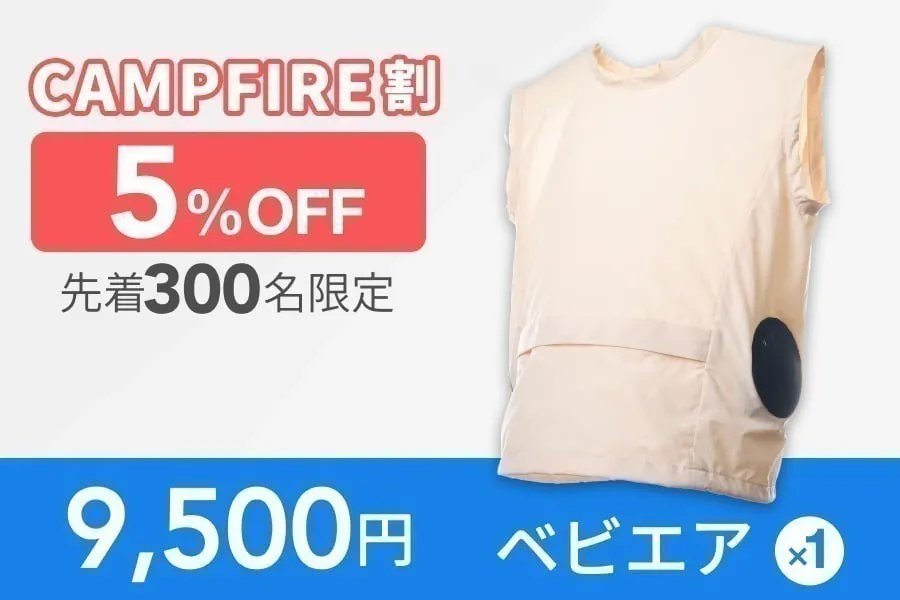 2026/03/16 09:31こんにちは!幼児向け熱中症対策ベスト「ベビエア」のクラウドファンディングがスタートしました!おかげ様で公開直後よりたくさんの反響を頂いており、ご用意したお得な割引プランが残りわずかになりつつあります!ご支援頂いた方にはどこよりも早くお届けします!キャンプファイア限定の割引プランもあります!今ご支援頂ければ6月中のお届けとなっておりまして、今年の夏に大活躍してくれるまずなのでよろしくお願いします! もっと見る