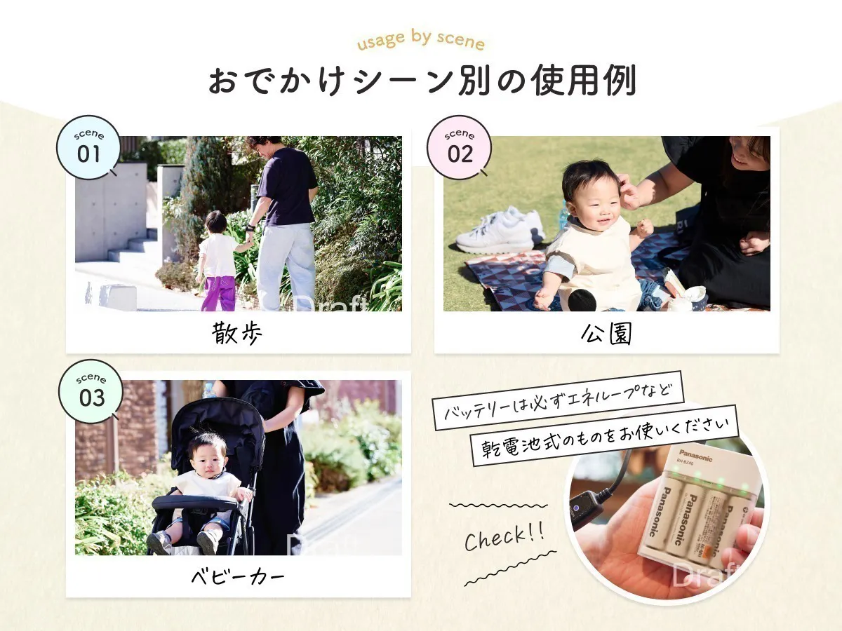 普段のお出かけならこれくらいでも問題ないと思いますが、例えば「テーマパークで1日遊ぶ」とかだと予備の電池も持って行く必要があります!