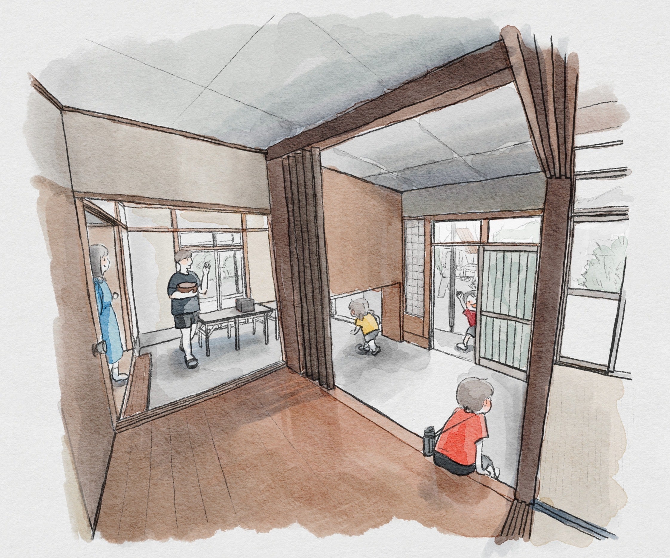 そんな日でも楽しく活動ができるように、大きなキッチンスペースと、走り回れる畳の広間を作ります。
