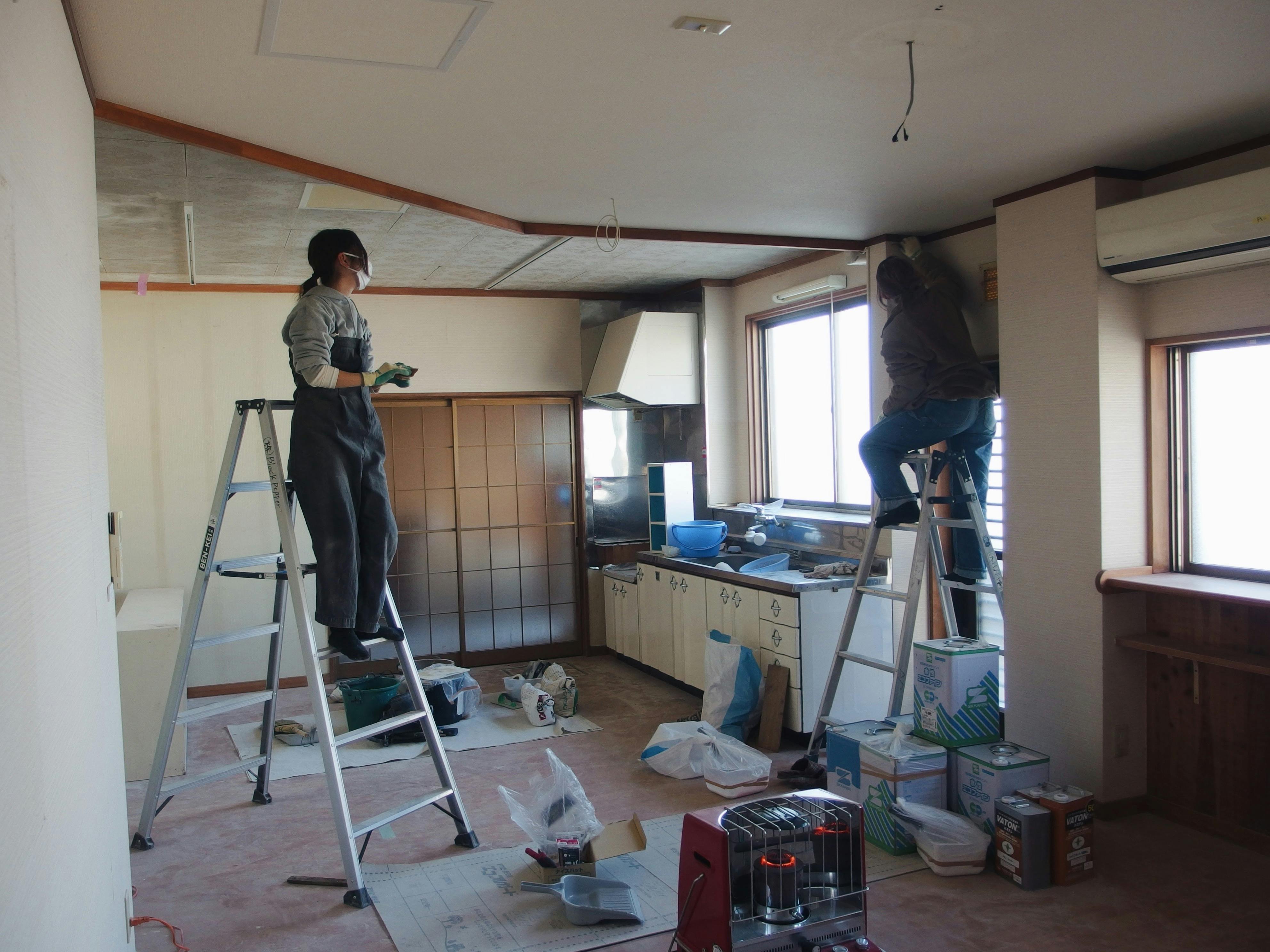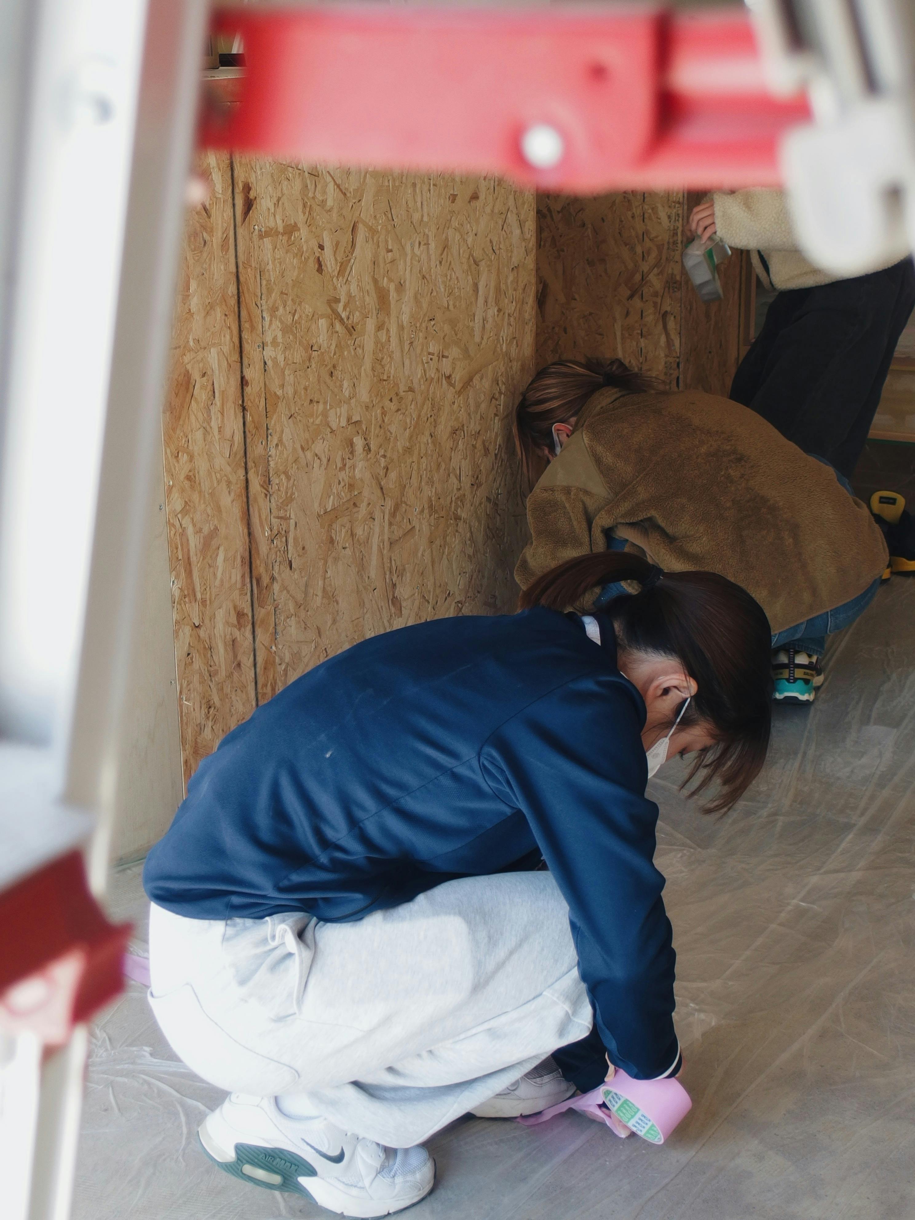 20日からのDIYイベントに向けて、今日はメンバー全員+お友達も手伝ってくれて、大事な下準備「養生」を進めました!