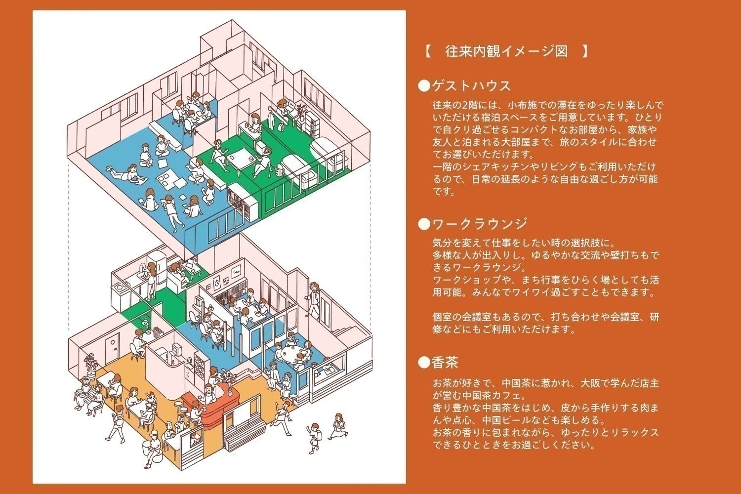 時間帯によって表情を変える飲食テナント〈香茶〉を併設。朝食、ランチ、夜の軽い一杯まで、地域の素材や季節の食材を取り入れながら提供予定。宿泊者だけでなく、まちの人も日常的に利用できる場所に。ひとりでも立ち寄りやすく、誰かと囲めば自然に会話が生まれる。食を通じて、往来に流れる時間を共有します。