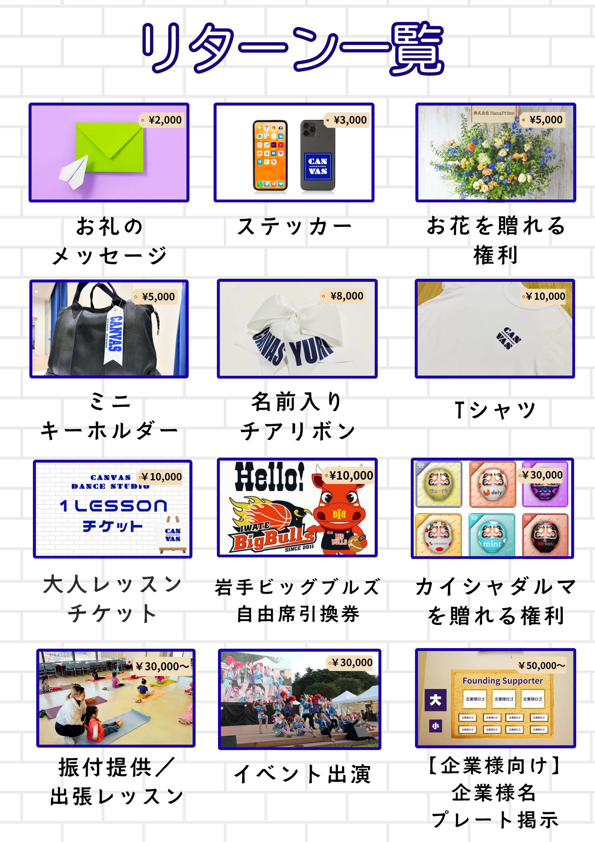 ご支援いただいた皆様には、心を込めてお礼のリターンをご用意いたします。チアリボンやスタジオオリジナルTシャツなどの記念品のほか、平日日中に新しく開講予定の大人向けクラス(ダンスフィットネスクラス、JAZZダンスクラス)の1レッスンチケットもご用意しています。企業様向けには、イベント出演やスタジオ階段踊り場への企業名掲載をご用意しております。支援してくださる皆様とのつながりを形にしたリターンで、スタジオの創出を共に感じていただければ幸いです。