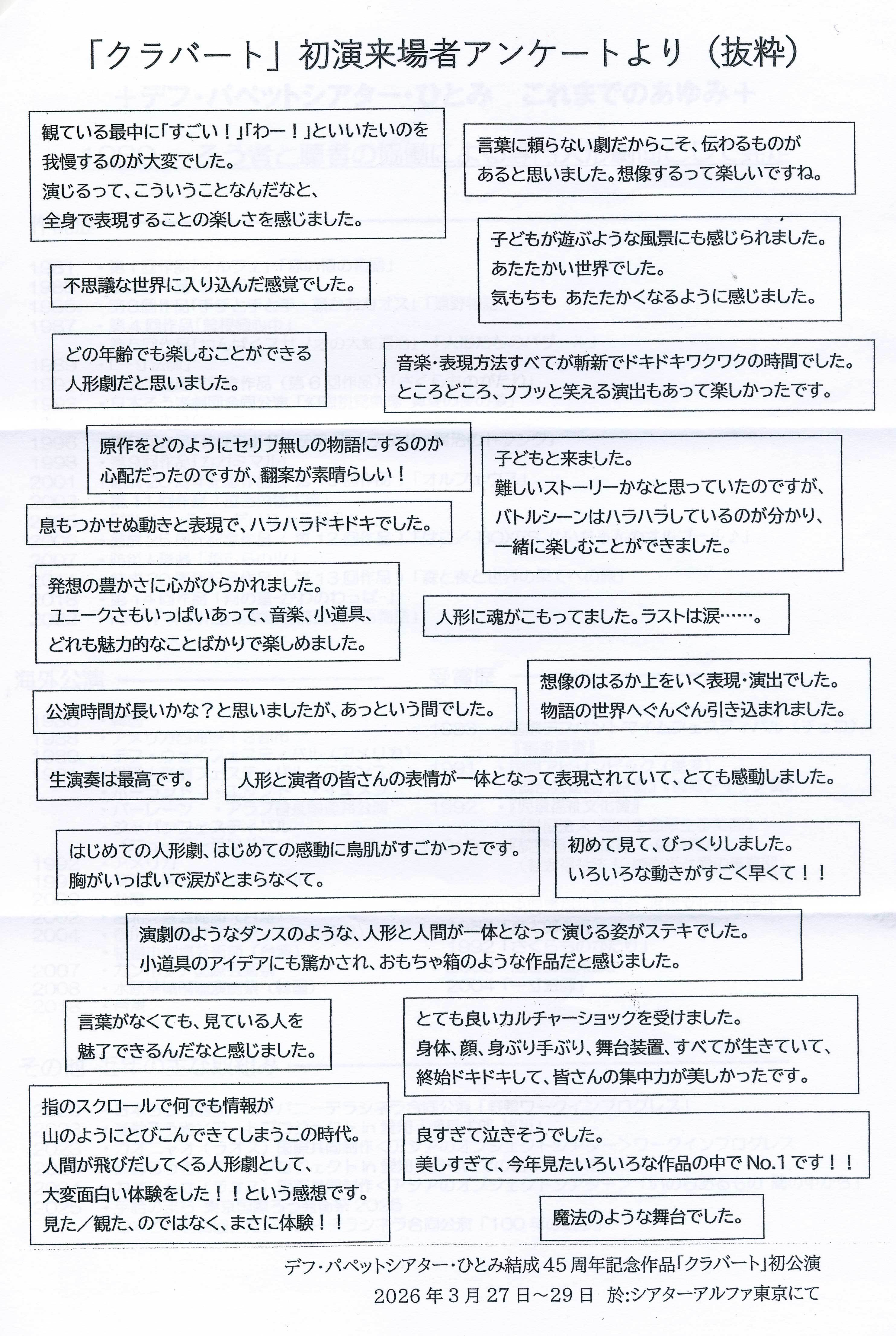 先日、ろう協会と手話の会の役員23名による実行委員会を発足しました。チラシもチケットも作成して、デフ・パペットシアター・ひとみ「クラバート」北九州公演に向けてりのPR宣伝活動を行っています。また、クラウドファンティング支援に対する皆様の暖かいご協力に心より感謝申し上げます。3月27日~29日シアター・アルファ東京で「クラバート」の初公演がありました。写真、観客からの感想を載せていますので、是非ご覧ください。東京初公演は大変好評のようで、私ども実行委員会はより多くの皆様にご覧いただけるように頑張りたいと思います。舞台での視聴可能は350名までとしています。近場の方はお早めにチケットをお買い求めください。 当協会事務局にて販売しております。ネット及びFAXでの予約も可能です。 (Eメール kitarou@kad.or.jp FAX 093-881-0114)