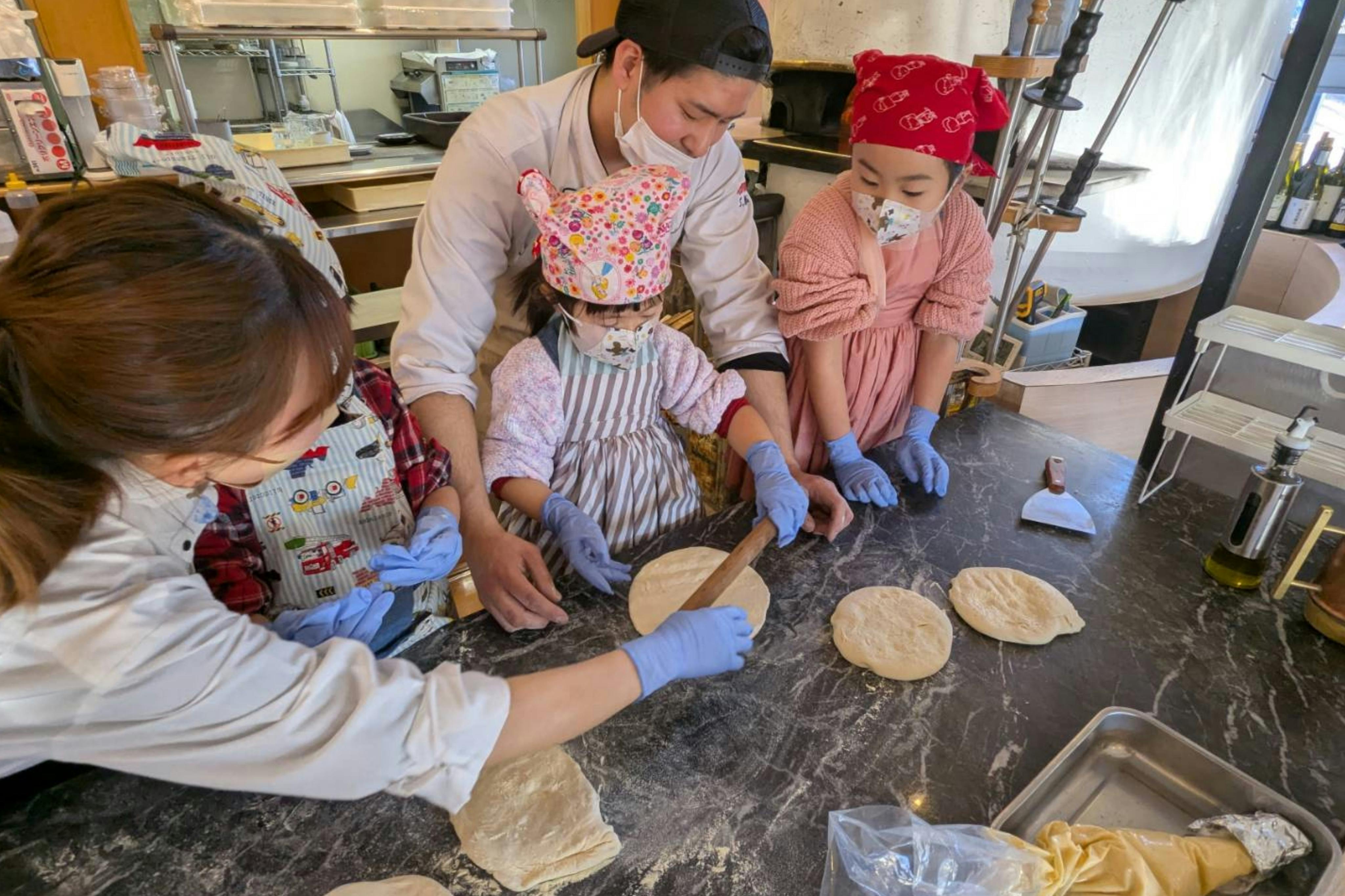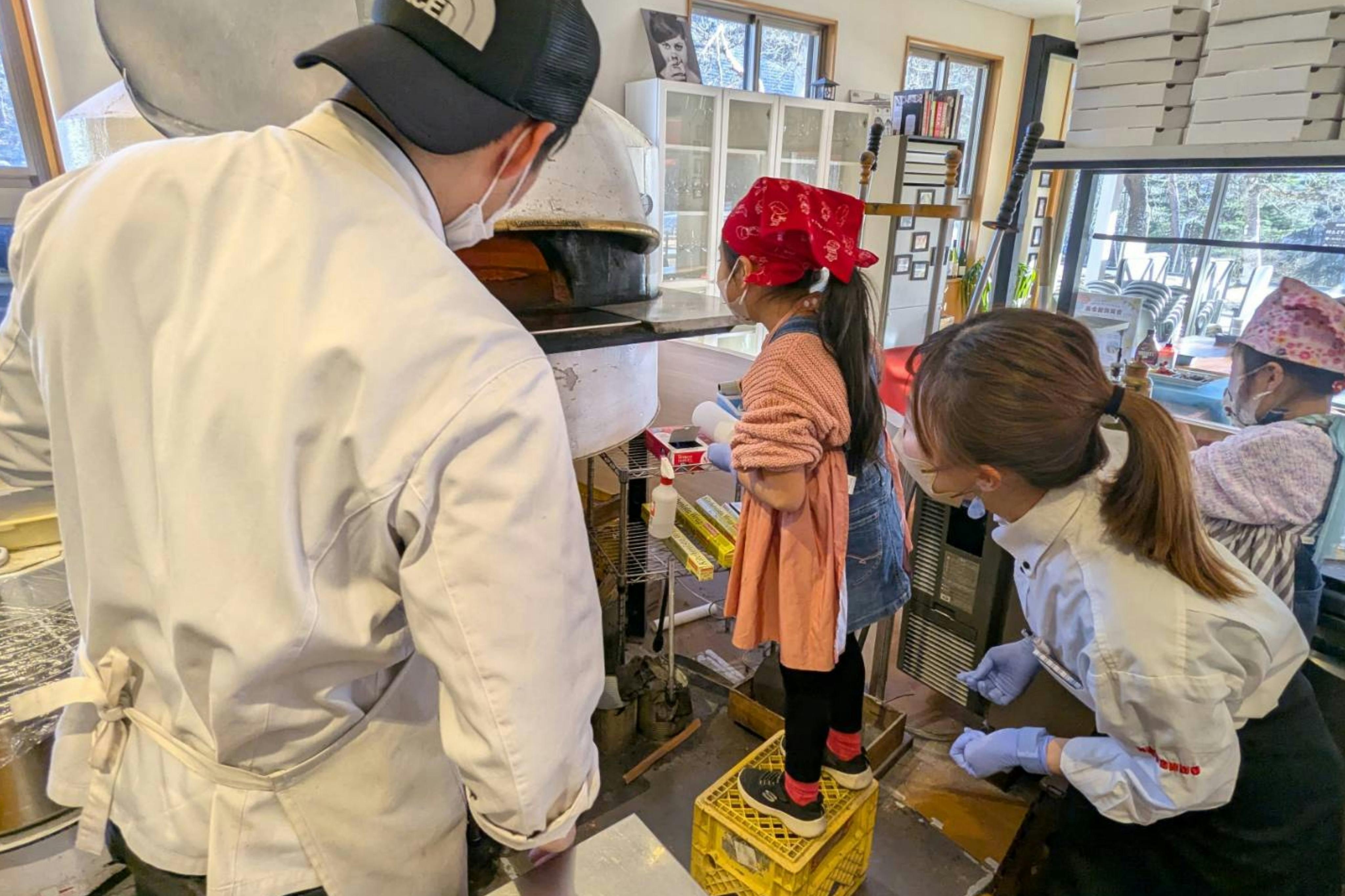 ピッツァの生地に触れ、好きな具材をのせて、自分で窯に入れて焼くという体験。