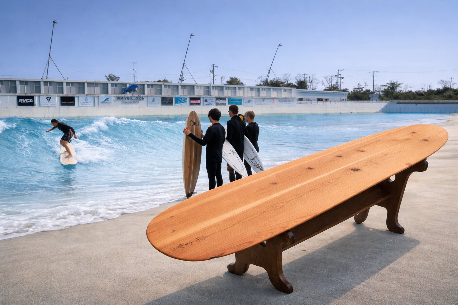 先日、静波サーフスタジアムのウェーブプールで開催されたイベントに出展し、現役プロサーファーの方々に三河杉で制作したアライアのテストライドを行っていただきました。