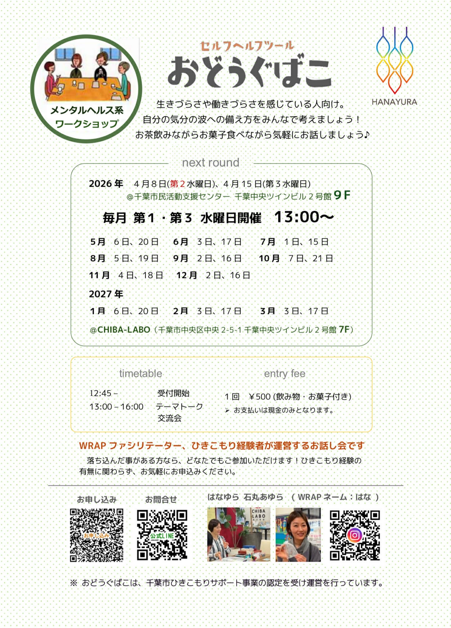 千葉市認定事業でもある「セルフヘルプサークル おどうぐばこ」では、お茶を飲みながら気軽に対話ができる場を提供し、“働き出す前の一歩”を支える活動をされています。