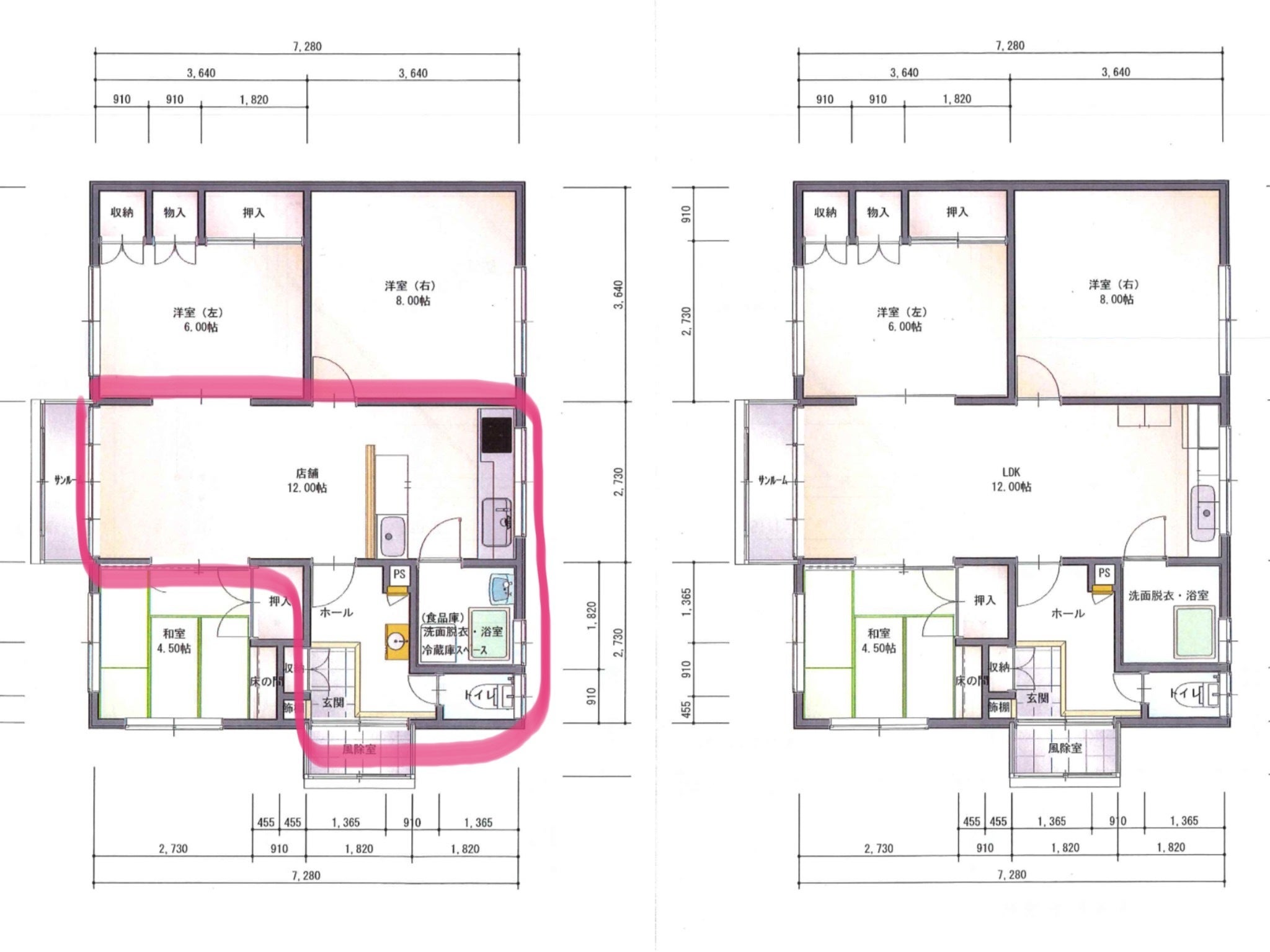 ピンクの箇所は業者様に、その他は自分たちでリノベーションする予定です。