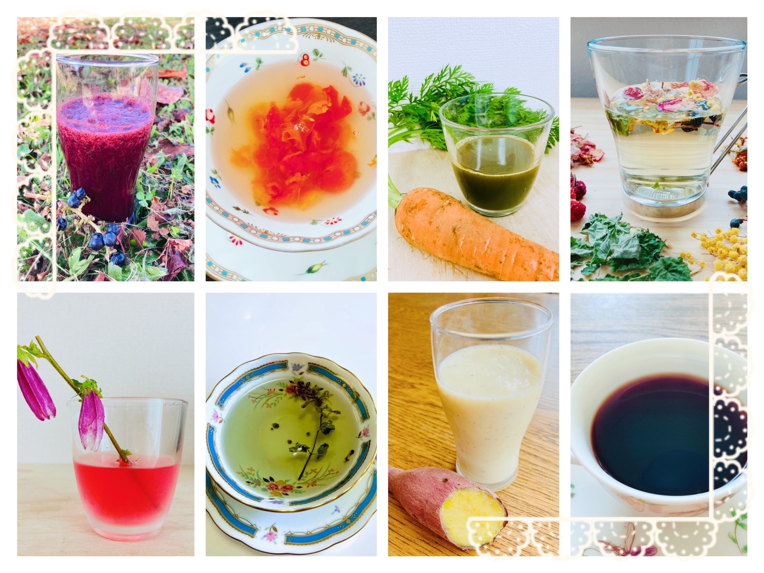 左上から、①山葡萄の生ジュース(補血に) ②ハマナスのローズヒップティー(ビタミンC) ③葉つき人参ジュース ④7種の薬草茶 ⑤ホタルブクロの色水ジュース ⑥野生スカルキャップ(立浪草)ティー(リラックス)⑦サツマイモのスムージー ⑧ネズミモチ茶(滋養強壮)