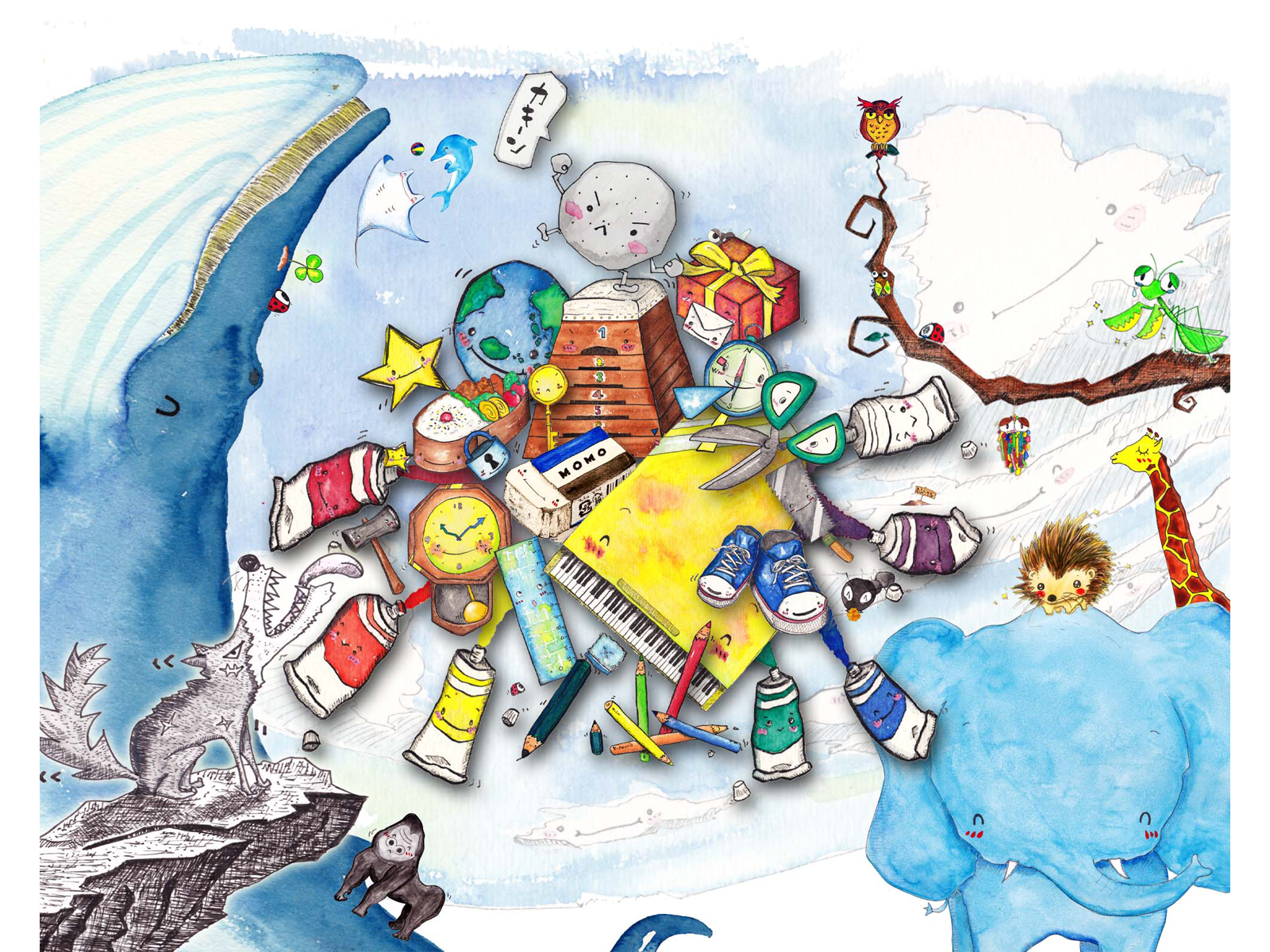 イラストは、ペン・水彩絵の具・写真のコラージュ等で描きます。