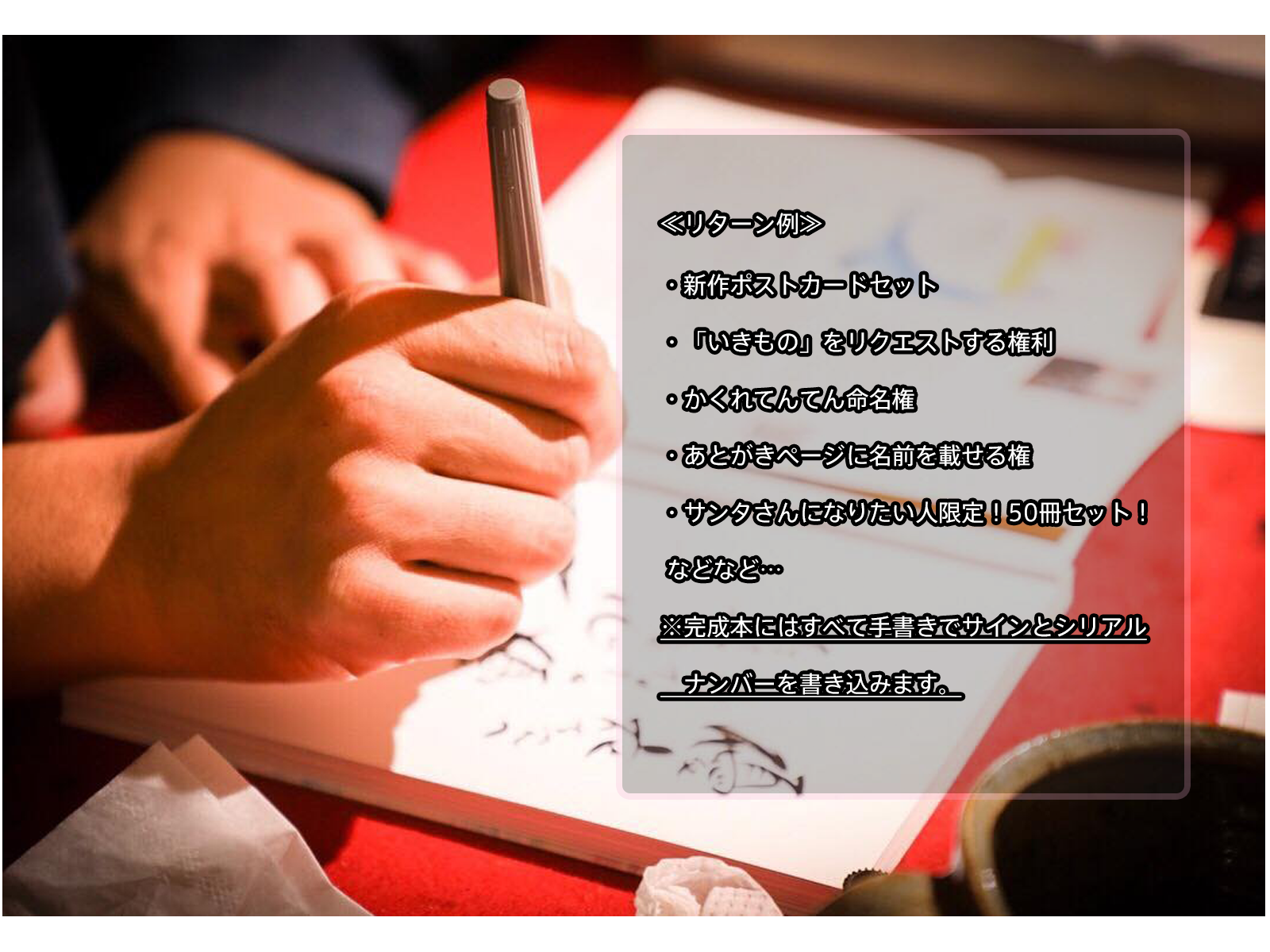 裏表紙に直筆でサインと一言メッセージを書いた完成本&新作ポストカードと一緒に金額に合わせた素敵なお返しをご用意いたします。