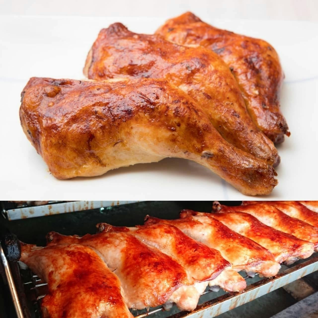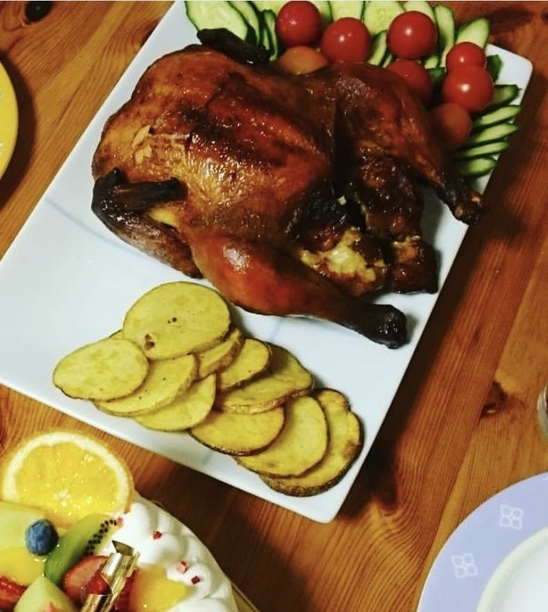 〈食卓に並んだ当店の若鶏の丸焼き〉