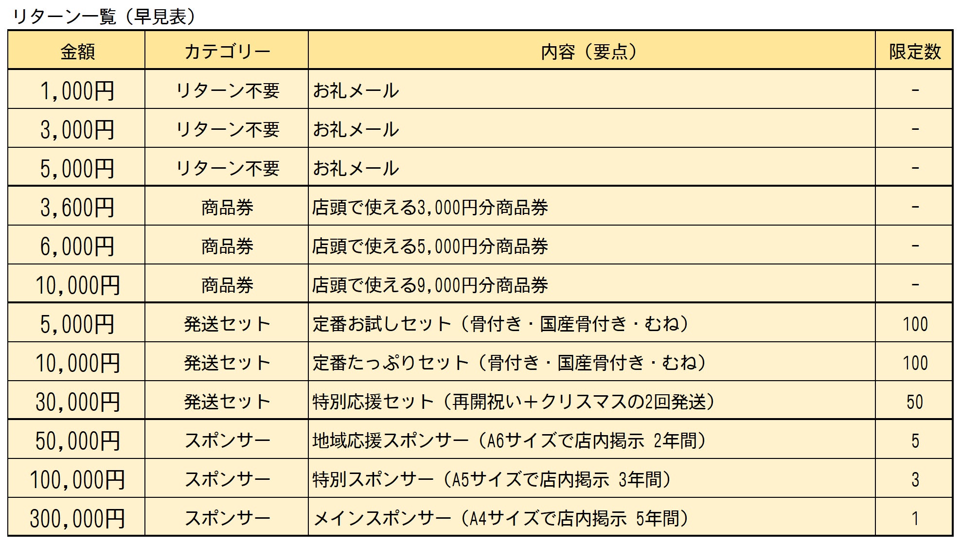 ※店舗規模の都合上、リターン発送は段階的に行います。高額リターンほど早期発送で対応いたします。
