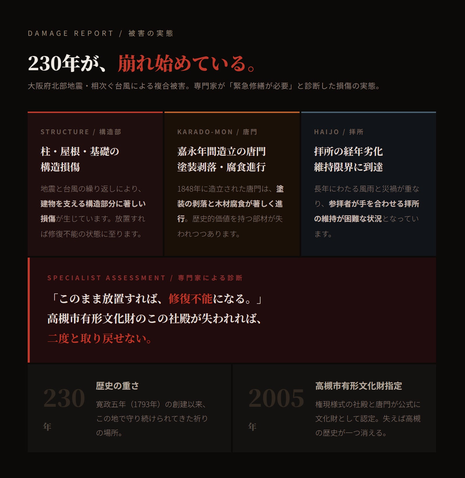 このまま修復されなければ、高槻市有形文化財の指定を受けたこの社殿は、